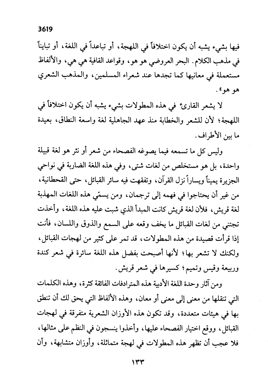 وليس كل ما تسمعه فيما يصوغه الفصحاء من شعر أو نثر هو لغة قبيلة واحدة، بل هو مستخلص من لغات شتى، وفي هذه اللغة الضارية في نواحي الجزيرة يمينًا ويسارًا نزل القرآن، وتفقهت فيه سائر القبائل، حتى القحطانية، من غير أن يحتاجوا في فهمه إلى ترجمان، ومن يسمّي هذه اللغات المهذبة لغة قريش، فلأن لغة قريش كانت المبدأ الذي شبت عليه هذه اللغة، وأخذت تجتني من لغات القبائل ما يخف وقعه على السمع والذوق واللسان، فأنت إذا قرأت قصيدة من هذه المطولات، قد تمر على كثير من لهجات القبائل، ولكنك لا تشعر بها؛ لأنها أصبحت بفضل هذه اللغة سائرة في شعر كندة وربيعة وقيس وتميم؛ كسيرها في شعر قريش.