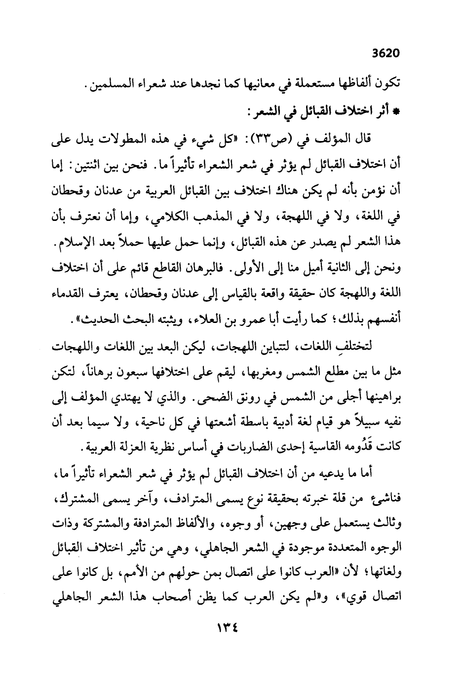 قال المؤلف في (ص 33): "كل شيء في هذه المطولات يدل على أن اختلاف القبائل لم يؤثر في شعر الشعراء تأثيراً ما. فنحن بين اثنتين: إما أن نؤمن بأنه لم يكن هناك اختلاف بين القبائل العربية من عدنان وقحطان في اللغة، ولا في اللهجة، ولا في المذهب الكلامي، وإما أن نعترف بأن هذا الشعر لم يصدر عن هذه القبائل، وإنما حمل عليها حملًا بعد الإسلام. ونحن إلى الثانية أميل منا إلى الأولى. فالبرهان القاطع قائم على أن اختلاف اللغة واللهجة كان حقيقة واقعة بالقياس إلى عدنان وقحطان، يعترف القدماء أنفسهم بذلك؛ كما رأيت أبا عمرو بن العلاء، ويثبته البحث الحديث".