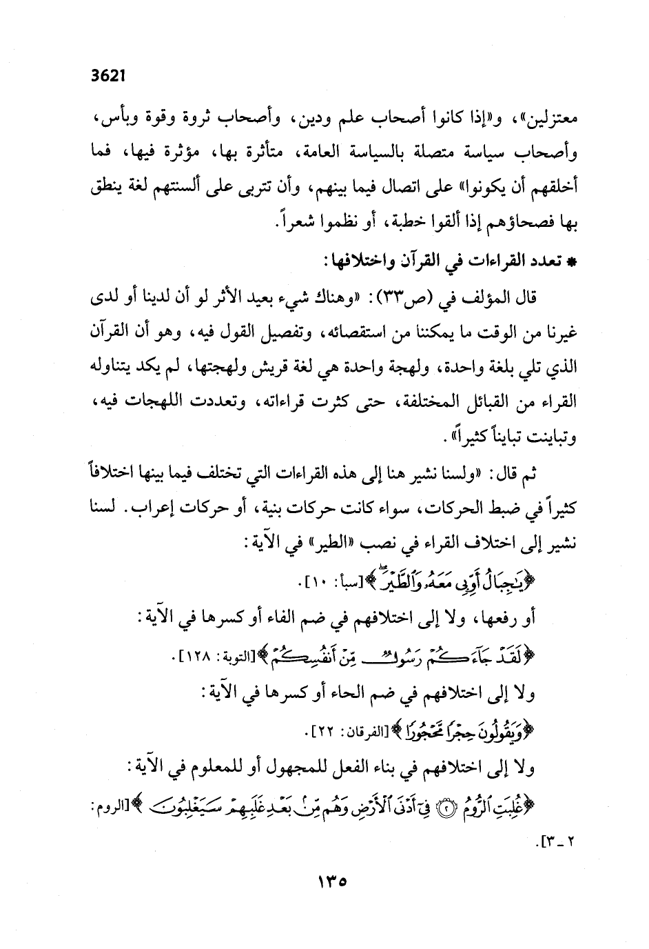 قال المؤلف في (ص 33): "وهناك شيء بعيد الأثر لو أن لدينا أو لدى غيرنا من الوقت ما يمكننا من استقصائه، وتفصيل القول فيه، وهو أن القرآن الذي تلي بلغة واحدة، ولهجة واحدة هي لغة قريش ولهجتها، لم يكد يتناوله القراء من القبائل المختلفة، حتى كثرت قراءاته، وتعددت اللهجات فيه، وتباينت تبايناً كثيراً".