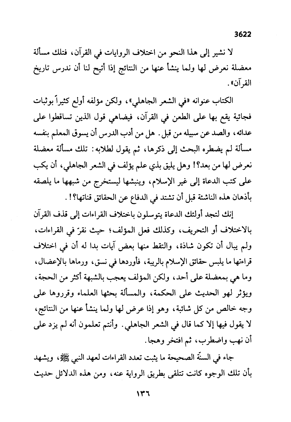 إنك لتجد أولئك الدعاة يتوسلون باختلاف القراءات إلى قذف القرآن بالاختلاف أو التحريف، وكذلك فعل المؤلف؛ حيث نقرّ في القراءات، ولم يبال أن تكون شاذة، والتقط منها بعض آيات بدًا له أن في اختلاف قراعتها ما يلبس حقائق الإسلام بالريبة، فأوردها في نسق، ورماها بالإعضال، وما هي بمعضلة على أحد، ولكن المؤلف يعجب بالشبهة أكثر من الحجة، ويؤثر لهوالحديث على الحكمة، والمسألة بحثها العلماء وقرروها على وجه خالص من كل شائبة، وهو إذا عرض لها ولما ينشأ عنها من النتائج، لا يقول فيها إلا كما قال في الشعر الجاهلي. وأنتم تعلمون أنه لم يزد على أن نهب واضطرب، ثم افتخر وهجا.
