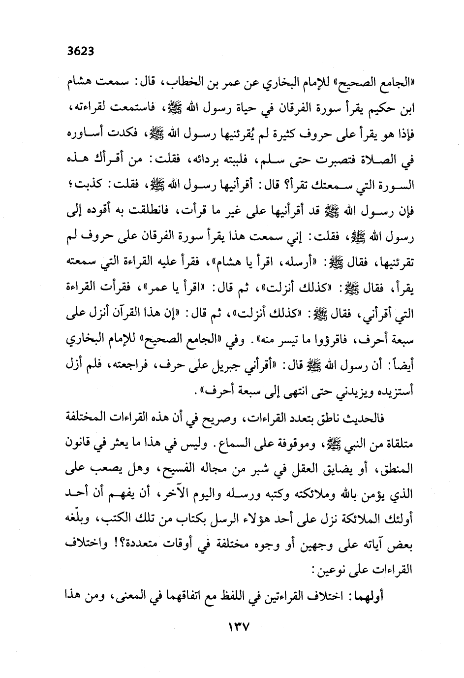 "الجامع الصحيح" للإمام البخاري عن عمر بن الخطاب، قال: سمعت هشام ابن حكيم يقرأ سورة الفرقان في حياة رسول الله - صلى الله عليه وسلم -، فاستمعت لقراءته، فإذا هو يقرأ على حروف كثيرة لم يُقرئنيها رسول الله - صلى الله عليه وسلم -، فكدت أساوره في الصلاة فتصبرت حتى سلم، فلببته بردائه، فقلت: من أقرأك هذه السورة التي سمعتك تقرأ؟ قال: أقرأنيها رسول الله - صلى الله عليه وسلم -، فقلت: كذبت؛ فإن رسول الله - صلى الله عليه وسلم - قد أقرأنيها على غير ما قرأت، فانطلقت به أقوده إلى رسول الله - صلى الله عليه وسلم -، فقلت: إني سمعت هذا يقرأ سورة الفرقان على حروف لم تقرئنيها، فقال - صلى الله عليه وسلم -: "أرسله، اقرأ يا هشام"، فقرأ عليه القراءة التي سمعته يقرأ، فقال - صلى الله عليه وسلم -: "كذلك أنزلت"، ثم قال: "اقرأ يا عمر"، فقرأت القراءة التي أقرأني، فقال - صلى الله عليه وسلم -: "كذلك أنزلت"، ثم قال: "إن هذا القرآن أنزل على سبعة أحرف، فاقرؤوا ما تيسر منه". وفي "الجامع الصحيح" للإمام البخاري أيضاً: أن رسول الله - صلى الله عليه وسلم - قال: "أقرأني جبريل على حرف، فراجعته، فلم أزل أستزيده ويزيدني حتى انتهى إلى سبعة أحرف".