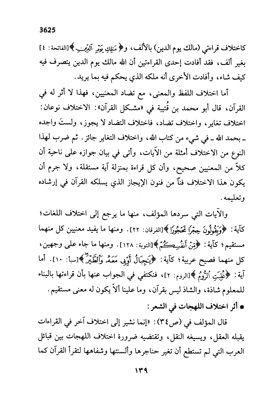والآيات التي سردها المؤلف، منها ما يرجع إلى اختلاف اللغات؛ كآية: {وَيَقُولُونَ حِجْرًا مَحْجُورًا} [الفرقان: 22]. ومنها ما يفيد معنيين كل منهما مستقيم، كآية: {مِنْ أَنْفُسِكُمْ} [التوبة: 128]. ومنها ما جاء على وجهين، كل منهما فصيح عربية؛ كآية: {يَاجِبَالُ أَوِّبِي مَعَهُ وَالطَّيْرَ} [سبأ: 10] أما آية: {غُلِبَتِ الرُّومُ} [الروم: 2] فنكتفي في الجواب عنها بأن قراءتها بالبناء للمعلوم شاذة، والشاذ ليس بقرآن، وما علينا ألّا يكون له معنى مستقيم.