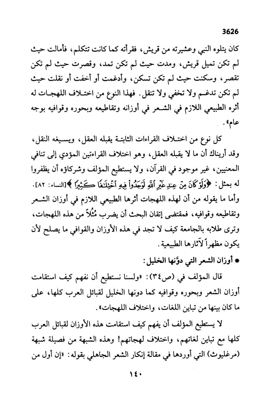 لا يستطيع المؤلف أن يفهم كيف استقامت هذه الأوزان لقبائل العرب كلها مع تباين لغاتهم، واختلاف لهجاتهم! وهذه الشبهة من فصيلة شبهة (مرغليوث) التي أوردها في مقالة إنكار الشعر الجاهلي بقوله: "إن أول من