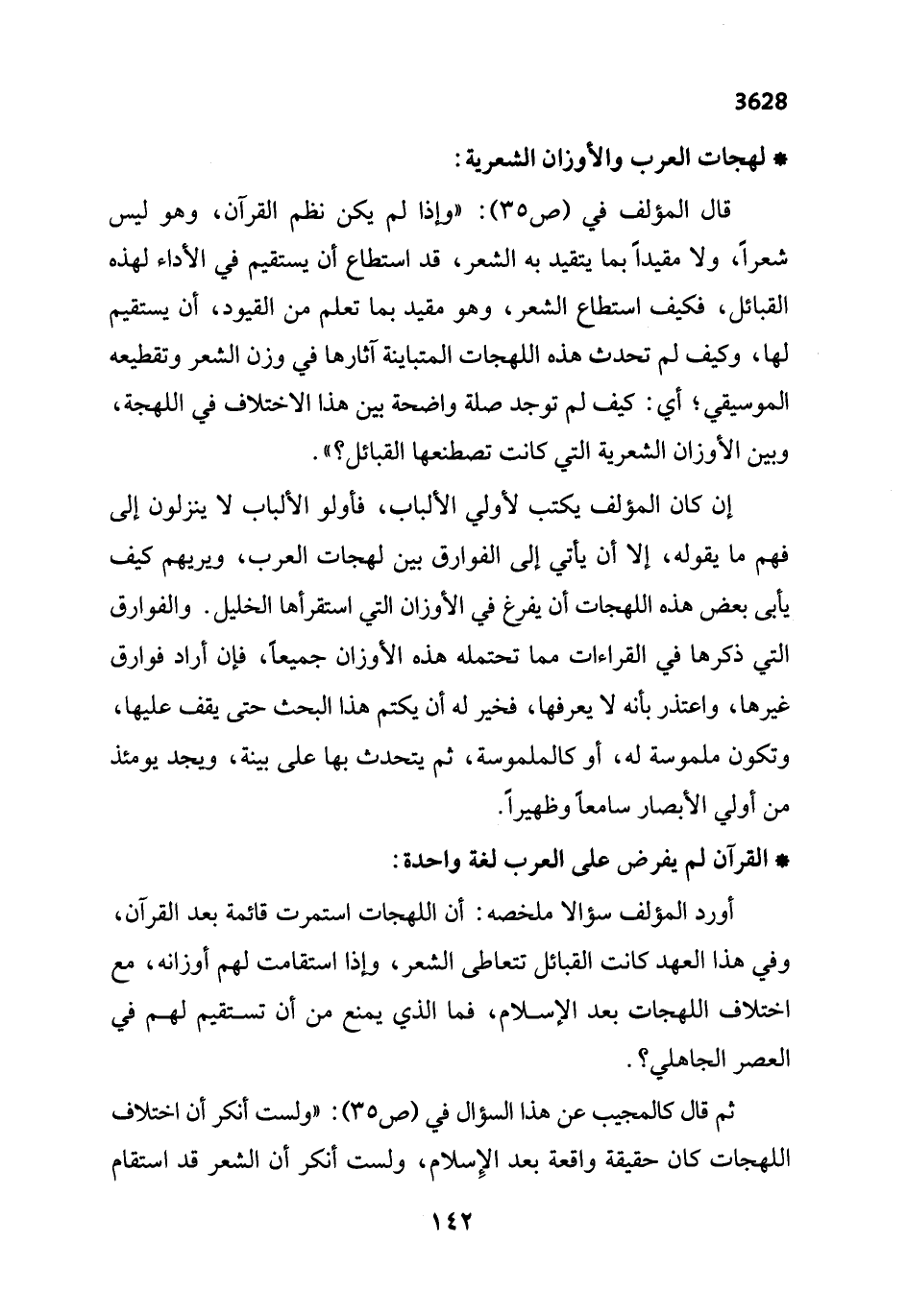 إن كان المؤلف يكتب لأولي الألباب، فأولو الألباب لا ينزلون إلى فهم ما يقوله، إلا أن يأتي إلى الفوارق بين لهجات العرب، ويريهم كيف يأبى بعض هذه اللهجات أن يفرغ في الأوزان التي استقرأها الخليل. والفوارق التي ذكرها في القراءات مما تحتمله هذه الأوزان جميعاً، فإن أراد فوارق غيرها، واعتذر بأنه لا يعرفها، فخير له أن يكتم هذا البحث حتى يقف عليها، وتكون ملموسة له، أو كالملموسة، ثم يتحدث بها على بينة، ويجد يومئذ من أولي الأبصار سامعًا وظهيرًا.