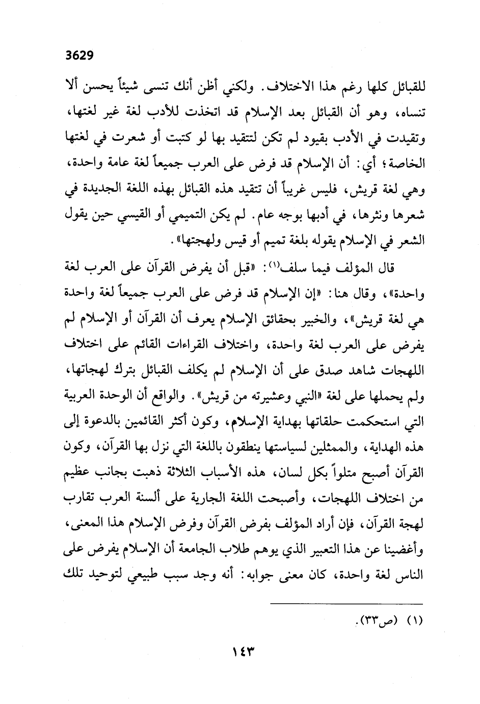 قال المؤلف فيما سلف (¬1): "قبل أن يفرض القرآن على العرب لغة واحدة"، وقال هنا: "إن الإسلام قد فرض على العرب جميعاً لغة واحدة هي لغة قريش"، والخبير بحقائق الإسلام يعرف أن القرآن أو الإسلام لم يفرض على العرب لغة واحدة، واختلاف القراءات القائم على اختلاف اللهجات شاهد صدق على أن الإسلام لم يكلف القبائل بترك لهجاتها، ولم يحملها على لغة "النبي وعشيرته من قريش". والواقع أن الوحدة العربية التي استحكمت حلقاتها بهداية الإسلام، وكون أكثر القائمين بالدعوة إلى هذه الهداية، والممثلين لسياستها ينطقون باللغة التي نزل بها القرآن، وكون القرآن أصبح متلواً بكل لسان، هذه الأسباب الثلاثة ذهبت بجانب عظيم من اختلاف اللهجات، وأصبحت اللغة الجارية على ألسنة العرب تقارب لهجة القرآن، فمان أراد المؤلف بفرض القرآن وفرض الإسلام هذا المعنى، وأغضينا عن هذا التعبير الذي يوهم طلاب الجامعة أن الإسلام يفرض على الناس لغة واحدة، كان معنى جوابه: أنه وجد سبب طبيعي لتوحيد تلك
