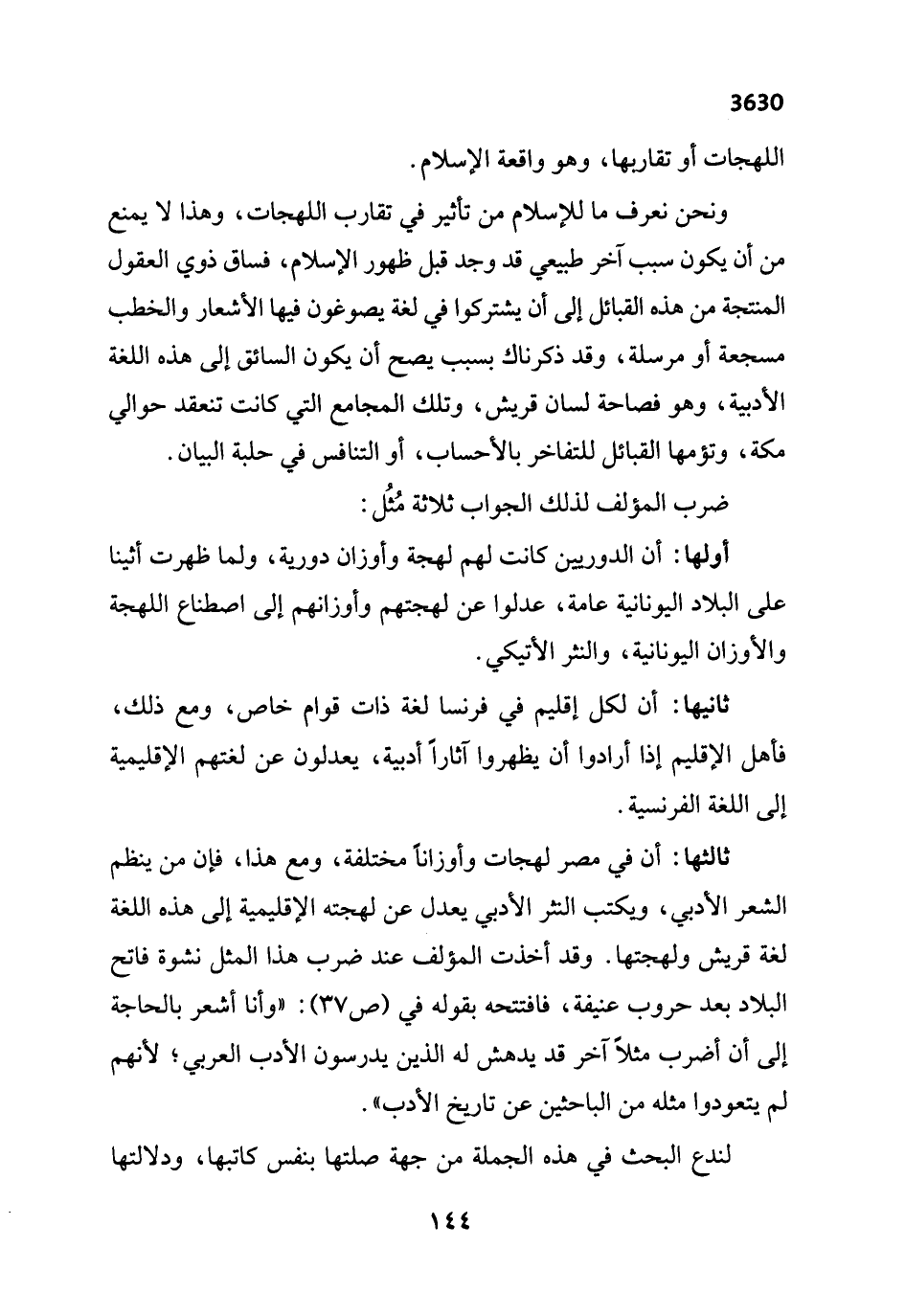 ثالثها: أن في مصر لهجات وأوزاناً مختلفة، ومع هذا، فإن من ينظم الشعر الأدبي، ويكتب النثر الأدبي يعدل عن لهجته الإقليمية إلى هذه اللغة لغة قريش ولهجتها. وقد أخذت المؤلف عند ضرب هذا المثل نشوة فاتح البلاد بعد حروب عنيفة، فافتتحه بقوله في (ص 37): "وأنا أشعر بالحاجة إلى أن أضرب مثلاً آخر قد يدهش له الذين يدرسون الأدب العربي؛ لأنهم لم يتعودوا مثله من الباحثين عن تاريخ الأدب".