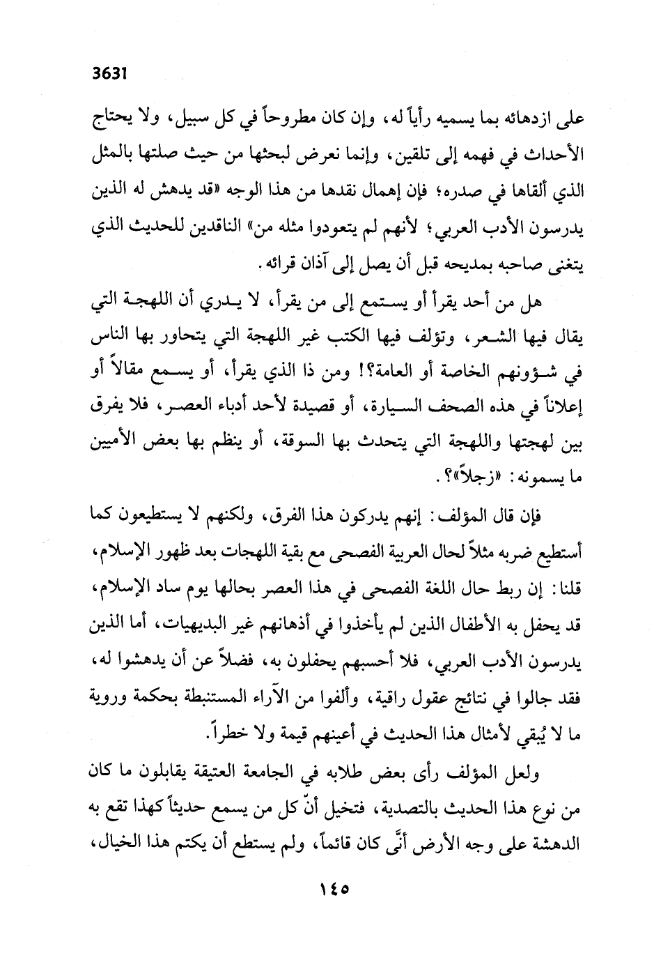 هل من أحد يقرأ أو يستمع إلى من يقرأ، لا يدري أن اللهجة التي يقال فيها الشعر، وتؤلف فيها الكتب غير اللهجة التي يتحاور بها الناس في شؤونهم الخاصة أو العامة؟! ومن ذا الذي يقرأ، أو يسمع مقالاً أو إعلانًا في هذه الصحف السيارة، أو قصيدة لأحد أدباء العصر، فلا يفرق بين لهجتها واللهجة التي يتحدث بها السوقة، أو ينظم بها بعض الأميين ما يسمونه: "زجلاً"؟.
