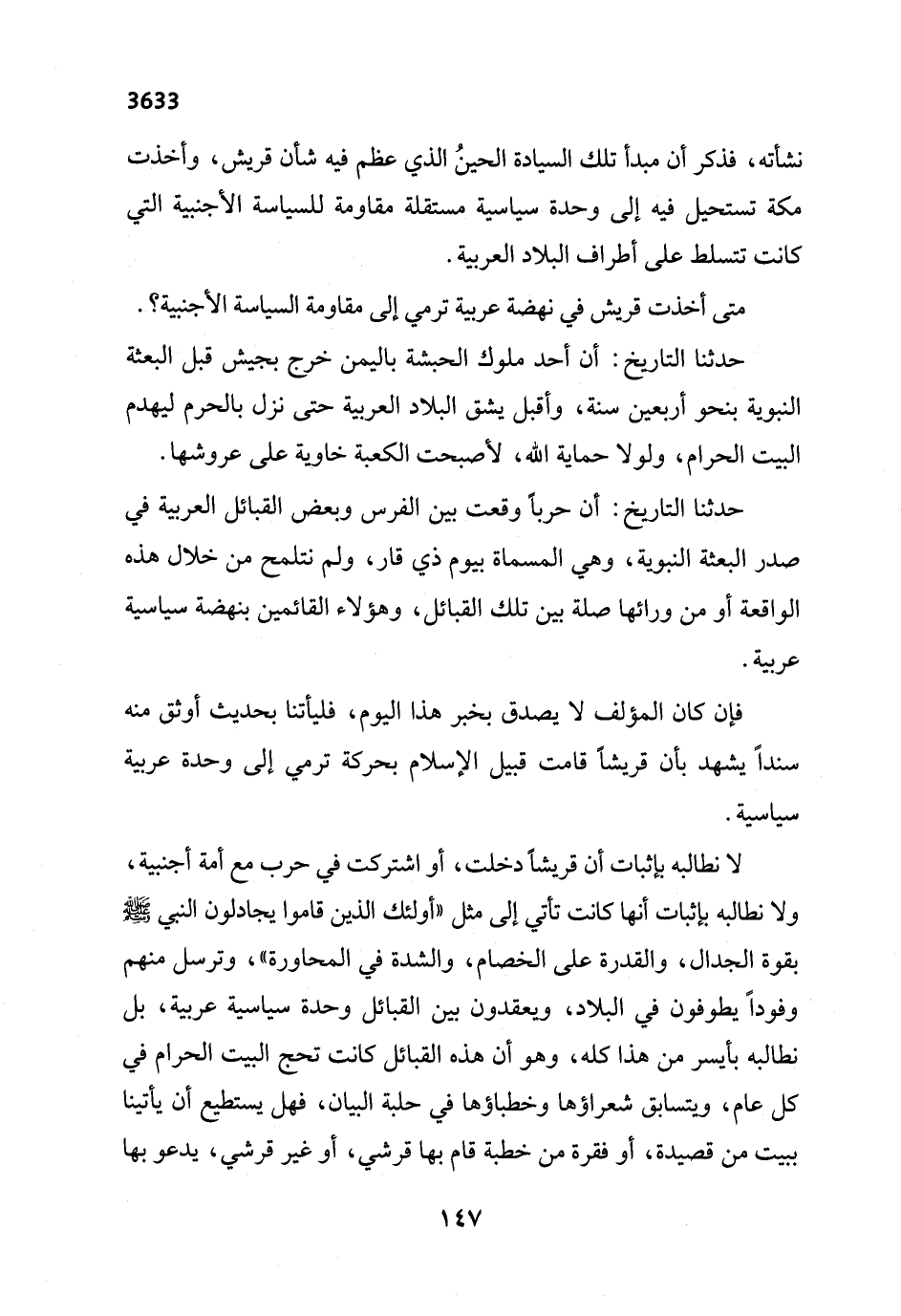 فإن كان المؤلف لا يصدق بخبر هذا اليوم، فليأتنا بحديث أوثق منه سندًا يشهد بأن قريشاً قامت قبيل الإسلام بحركة ترمي إلى وحدة عربية سياسية.
