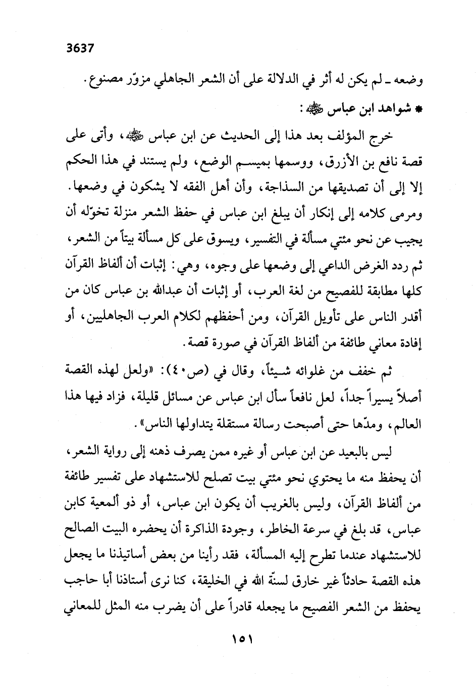 خرج المؤلف بعد هذا إلى الحديث عن ابن عباس - رضي الله عنه -، وأتى على قصة نافع بن الأزرق، ووسمها بميسم الوضع، ولم يستند في هذا الحكم إلا إلى أن تصديقها من السذاجة، وأن أهل الفقه لا يشكون في وضعها. ومرمى كلامه إلى إنكار أن يبلغ ابن عباس في حفظ الشعر منزلة تخوّله أن يجيب عن نحو مئتي مسألة في التفسير، ويسوق على كل مسألة بيتاً من الشعر، ثم ردد الغرض الداعي إلى وضعها على وجوه، وهي: إثبات أن ألفاظ القرآن كلها مطابقة للفصيح من لغة العرب، أو إثبات أن عبد الله بن عباس كان من أقدر الناس على تأويل القرآن، ومن أحفظهم لكلام العرب الجاهليين، أو إفادة معاني طائفة من ألفاظ القرآن في صورة قصة.