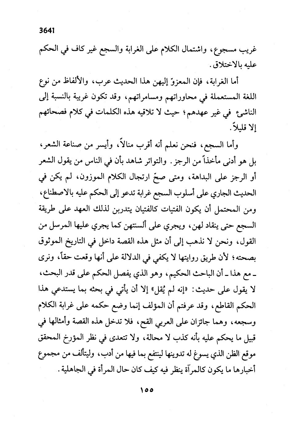 وأما السجع، فنحن نعلم أنه أقرب منالاً، وأيسر من صناعة الشعر، بل هو أدنى مأخذًا من الرجز. والتواتر شاهد بأن في الناس من يقول الشعر أو الرجز على البداهة، ومتى صحّ ارتجال الكلام الموزون، لم يكن في الحديث الجاري على أسلوب السجع غرابة تدعو إلى الحكم عليه بالاصطناع، ومن المحتمل أن يكون الفتيات كالفتيان يتدربن لذلك العهد على طريقة السجع حتى ينقاد لهن، ويجري على ألسنتهن كما يجري عليها المرسل من القول، ونحن لا نذهب إلى أن مثل هذه القصة داخل في التاريخ الموثوق بصحته؛ لأن طريق روايتها لا يكفي في الدلالة على أنها وقعت حقاً، ونرى -مع هذا- أن الباحث الحكيم، وهو الذي يفصل الحكم على قدر البحث، لا يقول على حديث: "إنه لم يُقل" إلا أن يأتي في بحثه بما يستدعي هذا الحكم القاطع، وقد عرفتم أن المؤلف إنما وضع حكمه على غرابة الكلام وسجعه، وهما جائزان على العربي القح، فلا تدخل هذه القصة وأمثالها في قبيل ما يحكم عليه بأنه كذب لا محالة، ولا تتعدى في نظر المؤرخ المحقق موقع الظن الذي يسوغ له تدوينها لينتفع بما فيها من أدب، وليتألف من مجموع أخبارها ما يكون كالمرآة ينظر فيه كيف كان حال المرأة في الجاهلية.