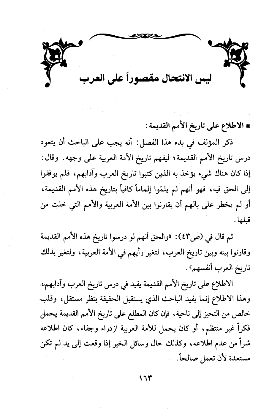 ثم قال في (ص 43): "والحق أنهم لو درسوا تاريخ هذه الأمم القديمة وقارنوا بينه وبين تاريخ العرب، لتغير رأيهم في الأمة العربية، ولتغير بذلك تاريخ العرب أنفسهم".