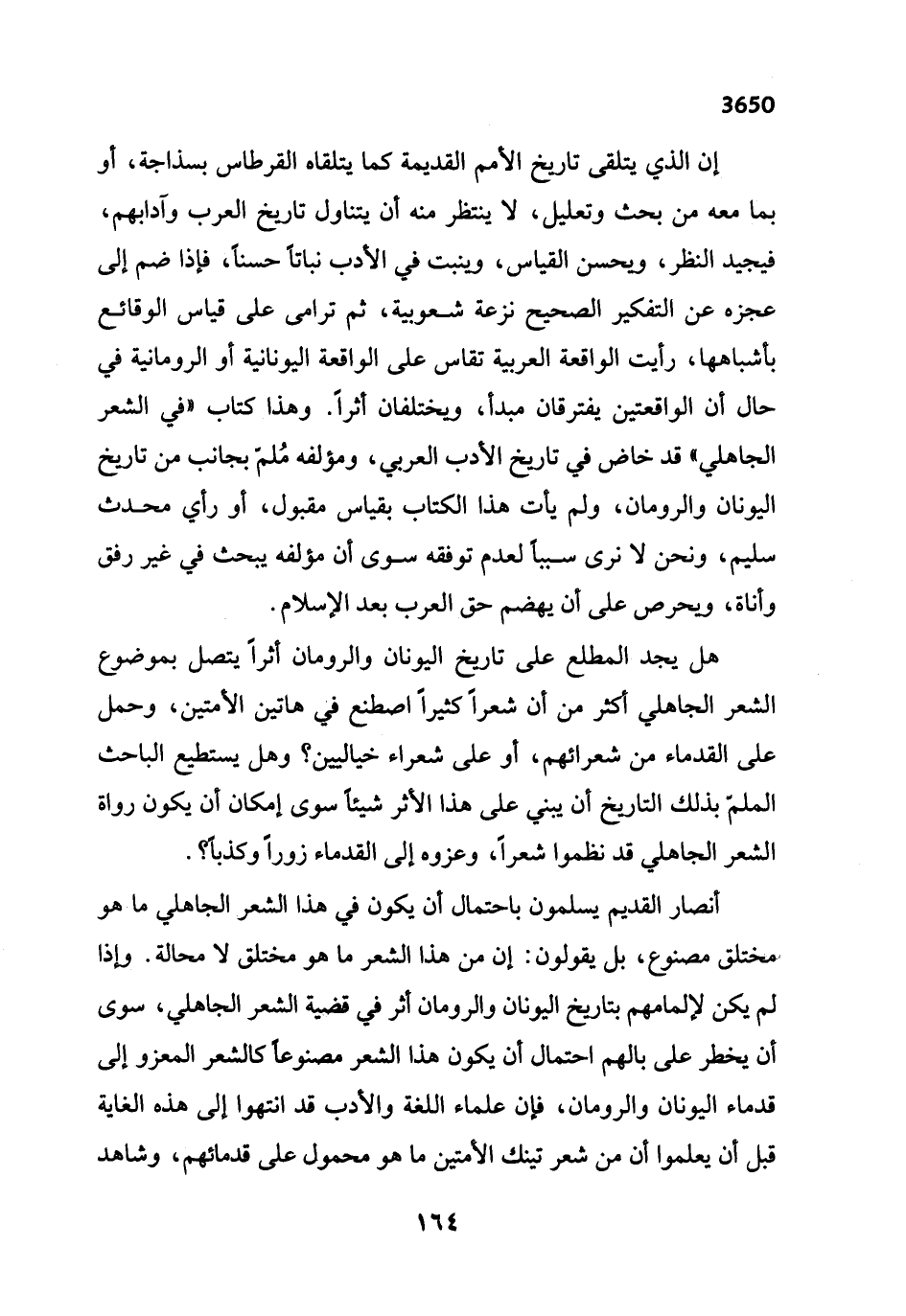إن الذي يتلقى تاريخ الأمم القديمة كما يتلقاه القرطاس بسذاجة، أو بما معه من بحث وتعليل، لا ينتظر منه أن يتناول تاريخ العرب وآدابهم، فيجيد النظر، ويحسن القياس، وينبت في الأدب نباتًا حسناً، فإذا ضم إلى عجزه عن التفكير الصحيح نزعة شعوبية، ثم ترامى على قياس الوقائع بأشباهها، رأيت الواقعة العربية تقاس على الواقعة اليونانية أو الرومانية في حال أن الواقعتين يفترقان مبدأ، ويختلفان أثراً. وهذا كتاب "في الشعر الجاهلي" قد خاض في تاريخ الأدب العربي، ومؤلفه مُلمّ بجانب من تاريخ اليونان والرومان، ولم يأت هذا الكتاب بقياس مقبول، أو رأي محدث سليم، ونحن لا نرى سبباً لعدم توفقه سوى أن مؤلفه يبحث في غير رفق وأناة، ويحرص على أن يهضم حق العرب بعد الاسلام.