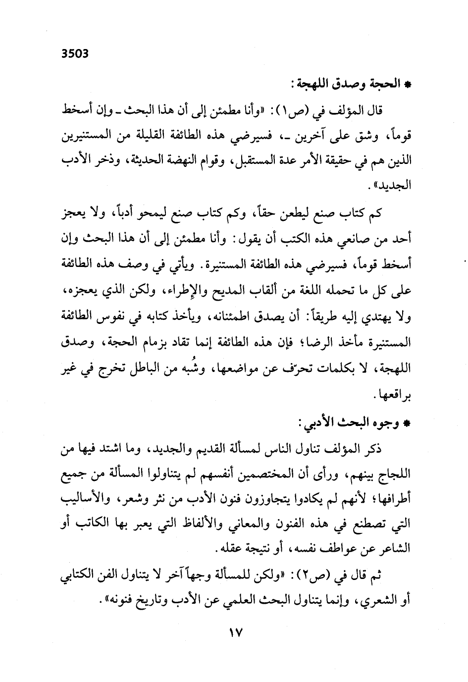 ثم قال في (ص 2): "ولكن للمسألة وجهاً آخر لا يتناول الفن الكتابي أو الشعري، وإنما يتناول البحث العلمي عن الأدب وتاريخ فنونه".