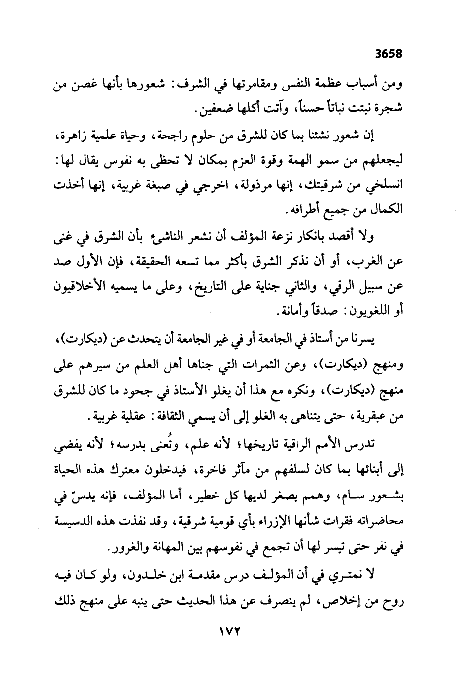 يسرنا من أستاذ في الجامعة أو في غير الجامعة أن يتحدث عن (ديكارت)، ومنهج (ديكارت)، وعن الثمرات التي جناها أهل العلم من سيرهم على منهج (ديكارت)، ونكره مع هذا أن يغلو الأستاذ في جحود ما كان للشرق من عبقرية، حتى يتناهى به الغلو إلى أن يسمي الثقافة: عقلية غربية.