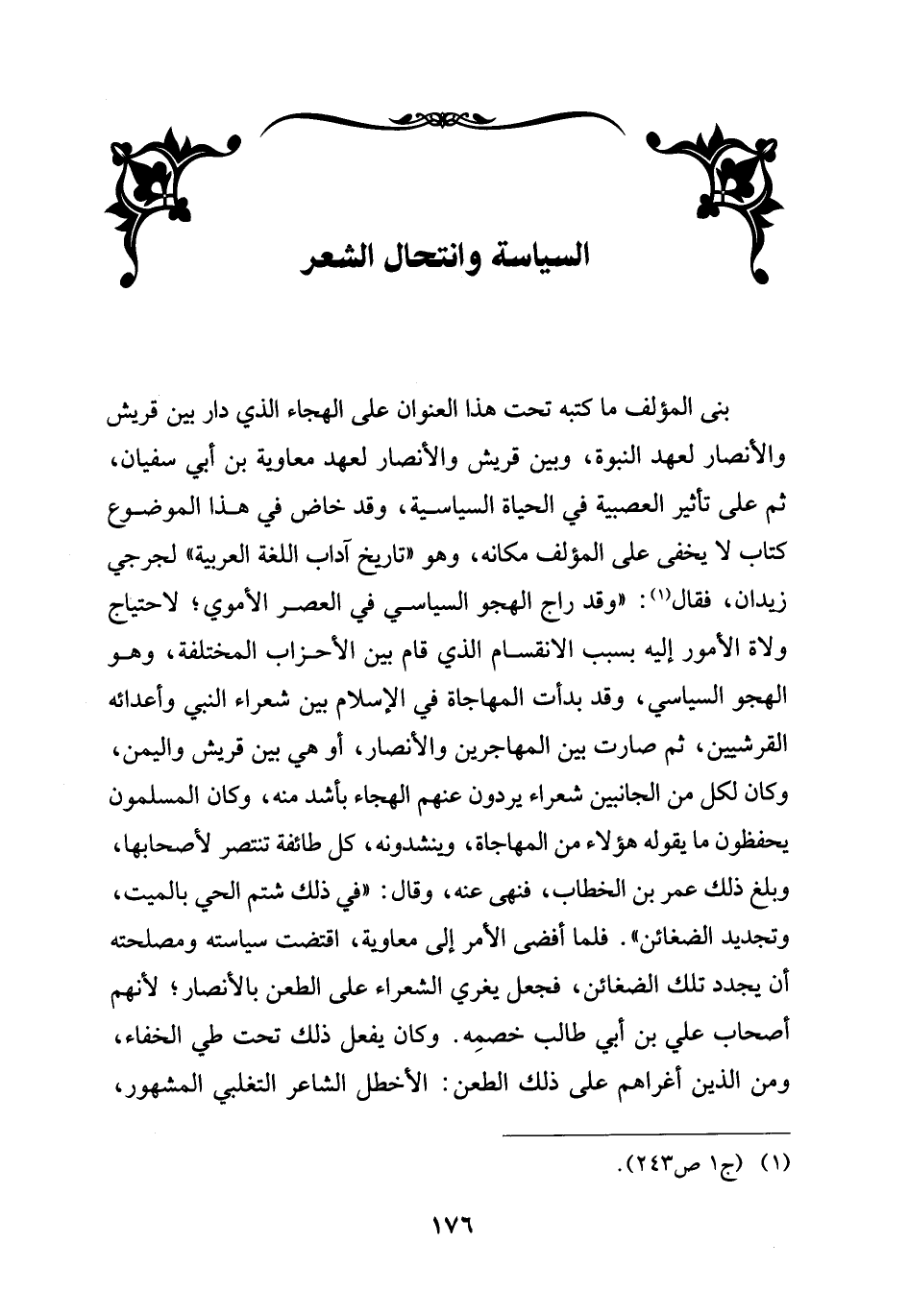 بنى المؤلف ما كتبه تحت هذا العنوان على الهجاء الذي دار بين قريش والأنصار لعهد النبوة، وبين قريش والأنصار لعهد معاوية بن أبي سفيان، ثم على تأثير العصبية في الحياة السياسية، وقد خاض في هذا الموضوع كتاب لا يخفى على المؤلف مكانه، وهو "تاريخ آداب اللغة العربية" لجرجي زيدان، فقال (¬1): "وقد راج الهجو السياسي في العصر الأموي؛ لاحتياج ولاة الأمور إليه بسبب الانقسام الذي قام بين الأحزاب المختلفة، وهو الهجو السياسي، وقد بدأت المهاجاة في الإسلام بين شعراء النبي وأعدائه القرشيين، ثم صارت بين المهاجرين والأنصار، أو هي بين قريش واليمن، وكان لكل من الجانبين شعراء يردون عنهم الهجاء بأشد منه، وكان المسلمون يحفظون ما يقوله هؤلاء من المهاجاة، وينشدونه، كل طائفة تنتصر لأصحابها، وبلغ ذلك عمر بن الخطاب، فنهى عنه، وقال: "في ذلك شتم الحي بالميت، وتجديد الضغائن". فلما أفضى الأمر إلى معاوية، اقتضت سياسته ومصلحته أن يجدد تلك الضغائن، فجعل يغري الشعراء على الطعن بالأنصار؛ لأنهم أصحاب علي بن أبي طالب خصمِه. وكان يفعل ذلك تحت طي الخفاء، ومن الذين أغراهم على ذلك الطعن: الأخطل الشاعر التغلبي المشهور،