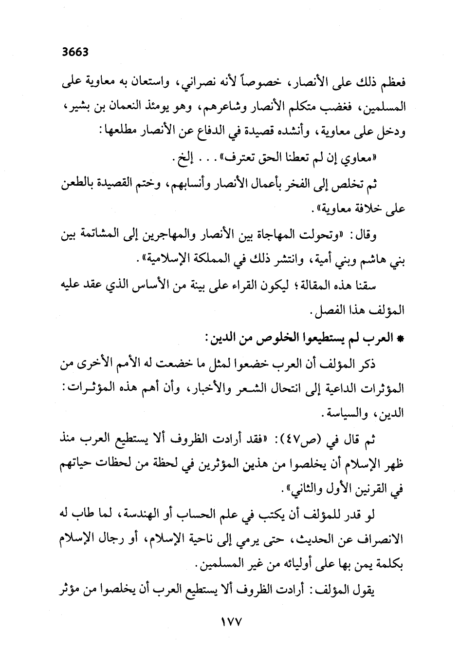 ثم قال في (ص 47): "فقد أرادت الظروف ألا يستطيع العرب منذ ظهر الإسلام أن يخلصوا من هذين المؤثرين في لحظة من لحظات حياتهم في القرنين الأول والثاني".