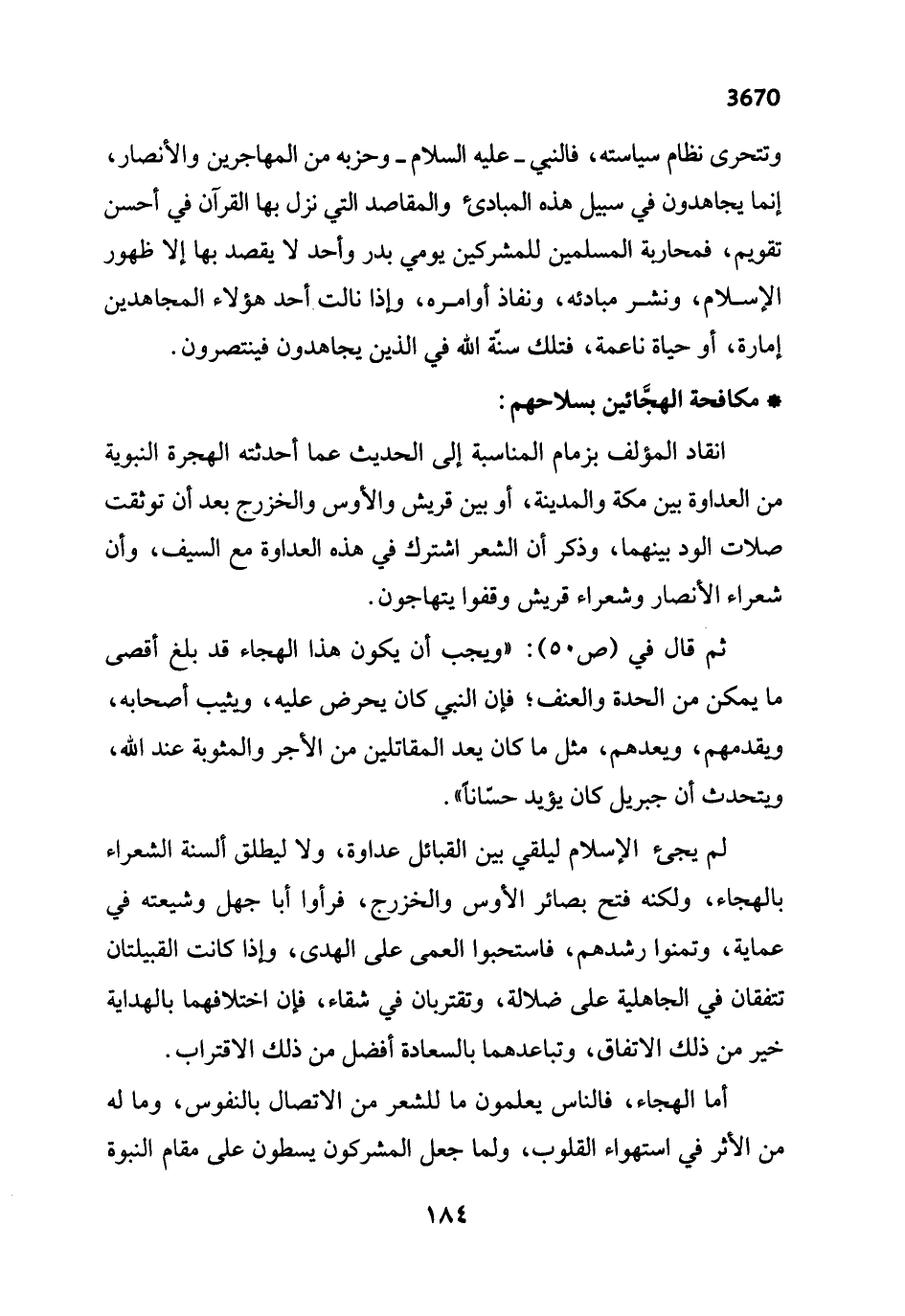 انقاد المؤلف بزمام المناسبة إلى الحديث عما أحدثته الهجرة النبوية من العداوة بين مكة والمدينة، أو بين قريش والأوس والخزرج بعد أن توثقت صلات الود بينهما، وذكر أن الشعر اشترك في هذه العداوة مع السيف، وأن شعراء الأنصار وشعراء قريش وقفوا يتهاجون.