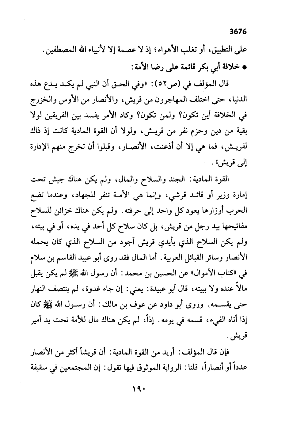 قال المؤلف في (ص 52): "وفي الحق أن النبي لم يكد يدع هذه الدنيا، حتى اختلف المهاجرون من قريش، والأنصار من الأوس والخزرج في الخلافة أين تكون؟ ولمن تكون؟ وكاد الأمر يفسد بين الفريقين لولا بقية من دين وحزم نفر من قريش، ولولا أن القوة المادية كانت إذ ذاك لقريش، فما هي إلا أن أذعنت، الأنصار، وقبلوا أن تخرج منهم الإدارة إلى قريش".