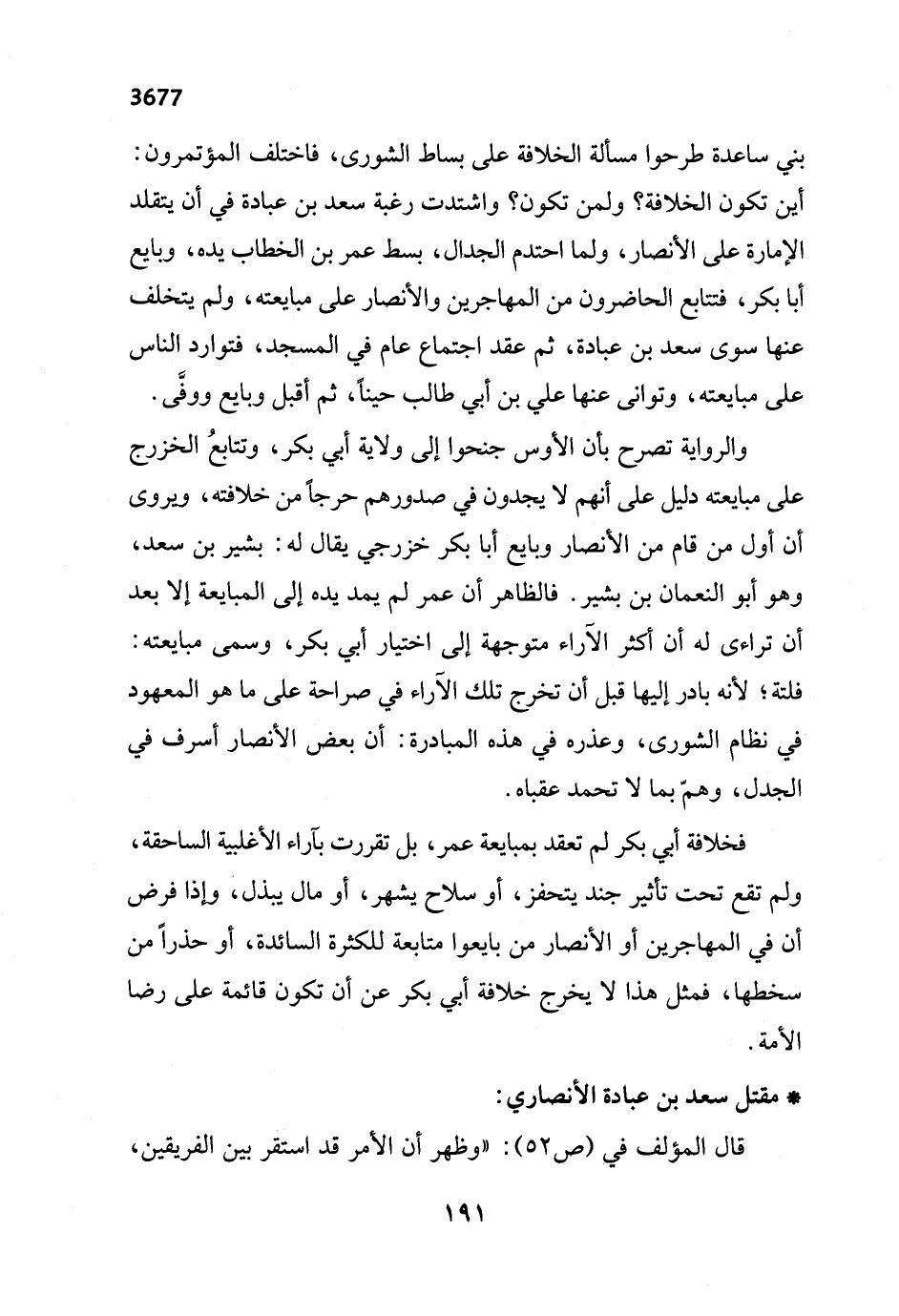 والرواية تصرح بن الأوس جنحوا إلى ولاية أبي بكر، وتتابعُ الخزرج على مبايعته دليل على أنهم لا يجدون في صدصورهم حرجاً من خلافته، ويروى أن أول من قام من الأنصار وبايع أبا بكر خزرجي يقال له: بشير بن سعد، وهو أبو النعمان بن بشير. فالظاهر أن عمر لم يمد يده إلى المبايعة إلا بعد أن تراءى له أن أكثر الآراء متوجهة إلى اختيار أبي بكر، وسمى مبايعته: فلتة؛ لأنه بادر إليها قبل أن تخرج تلك الآراء في صراحة على ما هو المعهود في نظام الشورى، وعذره في هذه المبادرة: أن بعض الأنصار أسرف في الجدل، وهمّ بما لا تحمد عقباه.