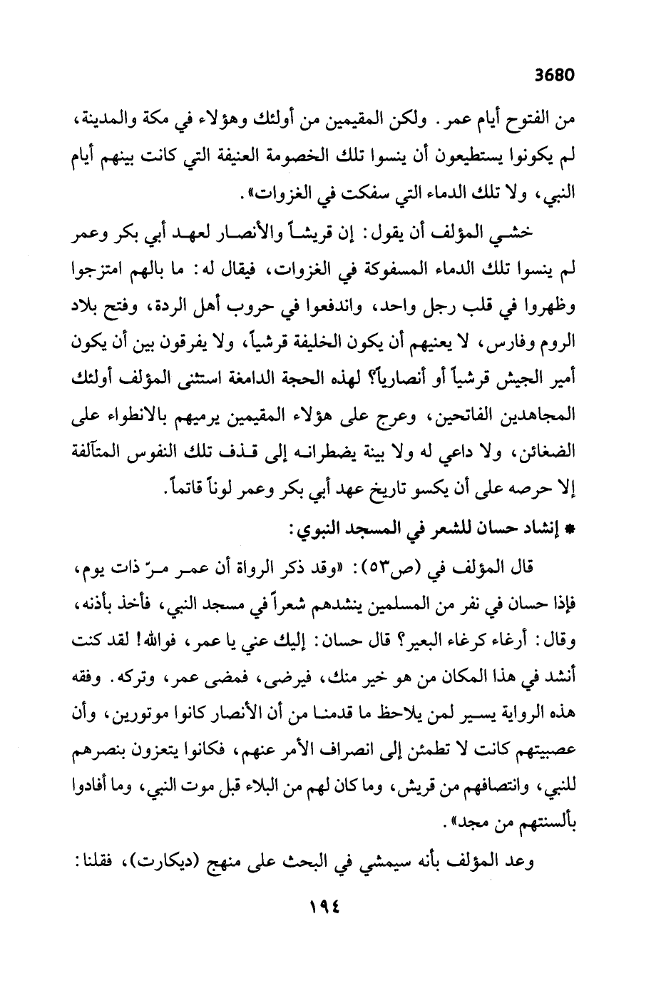 خشي المؤلف أن يقول: إن قريشاً والأنصار لعهد أبي بكر وعمر لم ينسوا تلك الدماء المسفوكة في الغزوات، فيقال له: ما بالهم امتزجوا وظهروا في قلب رجل واحد، واندفعوا في حروب أهل الردة، وفتح بلاد الروم وفارس، لا يعنيهم أن يكون الخليفة قرشياً، ولا يفرقون بين أن يكون أمير الجيش قرشياً أو أنصاريًا؟ لهذه الحجة الدامغة استثنى المؤلف أولئك المجاهدين الفاتحين، وعرج على هؤلاء المقيمين يرميهم بالانطواء على الضغائن، ولا داعي له ولا بينة يضطرانه إلى قذف تلك النفوس المتآلفة إلا حرصه على أن يكسو تاريخ عهد أبي بكر وعمر لوناً قاتمًا.