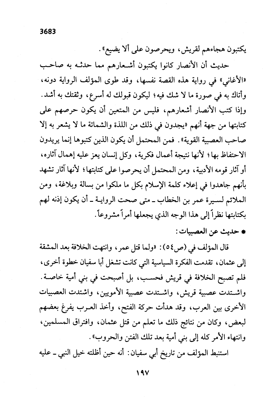 قال المؤلف في (ص 54): "ولما قتل عمر، وانتهت الخلافة بعد المشقة إلى عثمان، تقدمت الفكرة السياسية التي كانت تشغل أبا سفيان خطوة أخرى، فلم تصبح الخلافة في قريش فحسب، بل أصبحت في بني أمية خاصة. واشتدت عصبية قريش، واشتدت عصبية الأمويين، واشتدت العصبيات الأخرى بين العرب، وقد هدأت حركة الفتح، وأخذ العرب يفرغ بعضهم لبعض، وكان من نتائج ذلك ما تعلم من قتل عثمان، وافتراق المسلمين، وانتهاء الأمر كله إلى بني أمية بعد تلك الفتن والحروب".