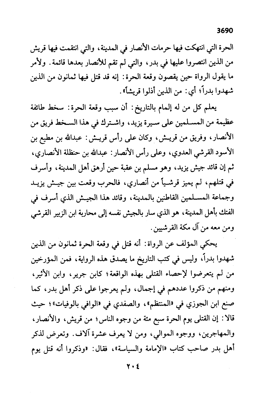 يحكي المؤلف عن الرواة: أنه قتل في وقعة الحرة ثمانون من الذين شهدوا بدراً، وليس في كتب التاريخ ما يصدق هذه الرواية، فمن المؤرخين من لم يتعرضوا لإحصاء القتلى بهذه الواقعة؛ كابن جرير، وابن الأثير، ومنهم من ذكروا عددهم في إجمال، ولم يعرجوا على ذكر أهل بدر، كما صنع ابن الجوزي في "المنتظم"، والصفدي في "الوافي بالوفيات"؛ حيث قالا: إن القتلى يوم الحرة سبع مئة من وجوه الناس؛ من قريش، والأنصار، والمهاجرين، ووجوه الموالي، ومن لا يعرف عشرة آلاف. وتعرض لذكر أهل بدر صاحب كتاب "الإمامة والسياسة"، فقال: "وذكروا أنه قتل يوم