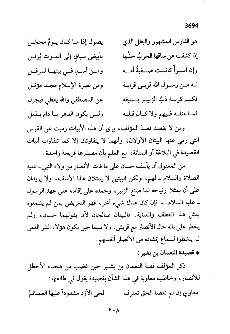 ذكر المؤلف قصة النعمان بن بشير حين غضب من هجاء الأخطل للأنصار، وخاطب معاوية في هذا الشأن بقصيدة يقول في طالعها: