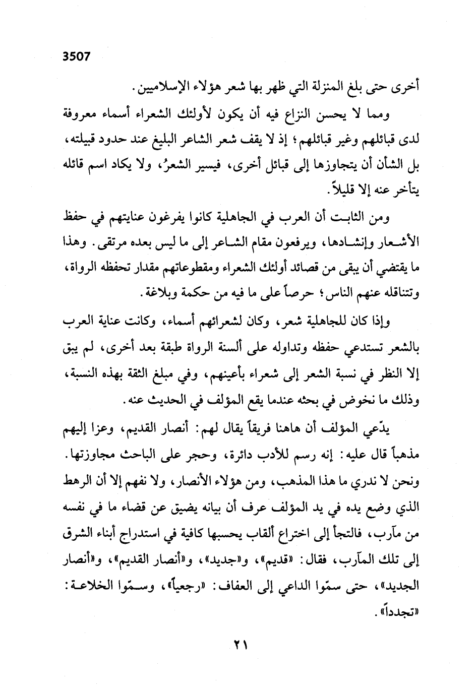 يدّعي المؤلف أن هاهنا فريقاً يقال لهم: أنصار القديم، وعزا إليهم مذهباً قال عليه: إنه رسم للأدب دائرة، وحجر على الباحث مجاوزتها. ونحن لا ندري ما هذا المذهب، ومن هؤلاء الأنصار، ولا نفهم إلا أن الرهط الذي وضع يده في يد المؤلف عرف أن بيانه يضيق عن قضاء ما في نفسه من مآرب، فالتجأ إلى اختراع ألقاب يحسبها كافية في استدراج أبناء الشرق إلى تلك المآرب، فقال: "قديم"، و"جديد"، و"أنصار القديم"، و"أنصار الجديد"، حتى سمّوا الداعي إلى العفاف: "رجعيا"، وسمّوا الخلاعة: "تجدداً".