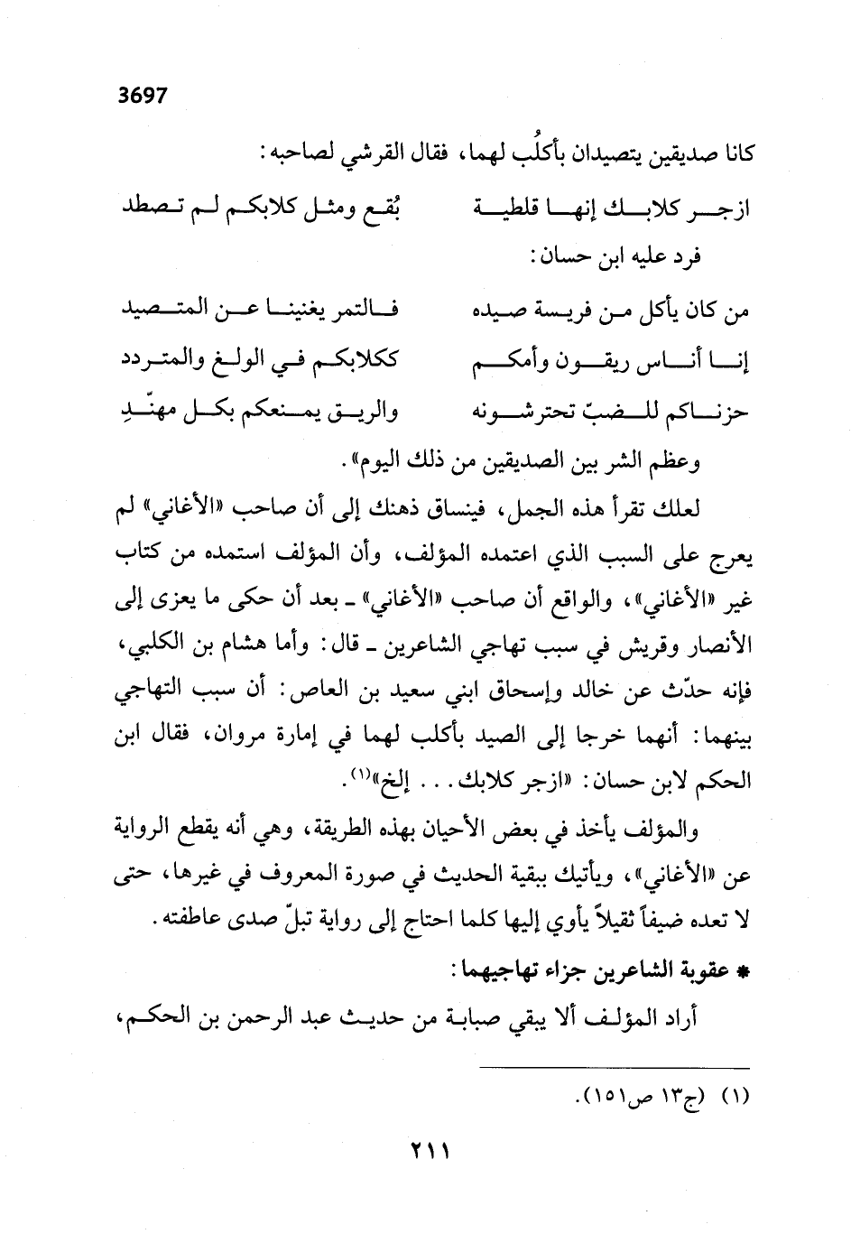 لعلك تقرأ هذه الجمل، فينساق ذهنك إلى أن صاحب "الأغاني" لم يعرج على السبب الذي اعتمده المؤلف، وأن المؤلف استمده من كتاب غير "الأغاني"، والواقع أن صاحب "الأغاني" -بعد أن حكى ما يعزى إلى الأنصار وقريش في سبب تهاجي الشاعرين- قال: وأما هشام بن الكلبي، فإنه حدّث عن خالد د سحاق ابني سعيد بن العاص: أن سبب التهاجي بينهما: أنهما خرجا إلى الصيد بأكلب لهما في إمارة مروان، فقال ابن الحكم لابن حسان: "ازجر كلابك ... إلخ" (¬1).