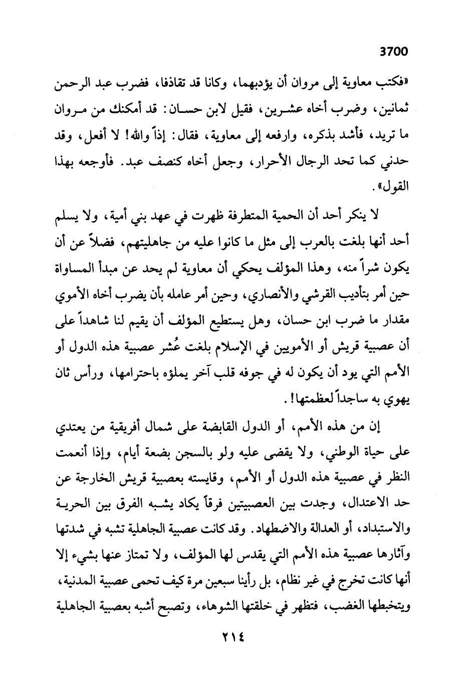لا ينكر أحد أن الحمية المتطرفة ظهرت في عهد بني أمية، ولا يسلم أحد أنها بلغت بالعرب إلى مثل ما كانوا عليه من جاهليتهم، فضلاً عن أن يكون شراً منه، وهذا المؤلف يحكي أن معاوية لم يحد عن مبدأ المساواة حين أمر بتأديب القرشي والأنصاري، وحين أمر عامله بأن يضرب أخاه الأموي مقدار ما ضرب ابن حسان، وهل يستطيع المؤلف أن يقيم لنا شاهداً على أن عصبية قريش أو الأمويين في الإسلام بلغت عُشر عصبية هذه الدول أو الأمم التي يود أن يكون له في جوفه قلب آخر يملؤه باحترامها، ورأس ثان يهوي به ساجداً لعظمتها!.