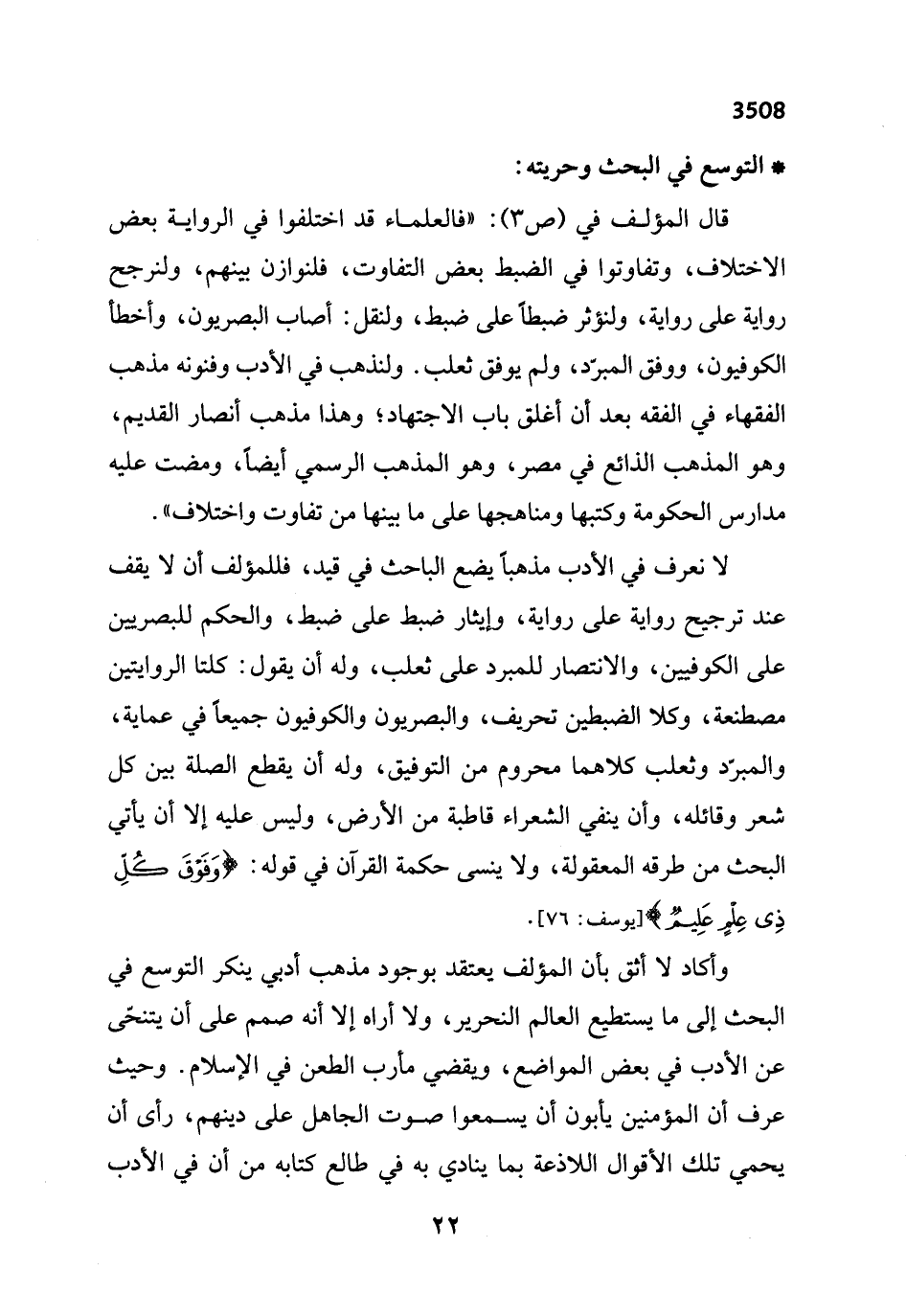 قال المؤلف في (ص 3): "فالعلماء قد اختلفوا في الرواية بعض الاختلاف، وتفاوتوا في الضبط بعض التفاوت، فلنوازن بينهم، ولنرجح رواية على رواية، ولنؤثر ضبطاً على ضبط، ولنقل: أصاب البصريون، وأخطأ الكوفيون، ووفق المبرّد، ولم يوفق ثعلب. ولنذهب في الأدب وفنونه مذهب الفقهاء في الفقه بعد أن أغلق باب الاجتهاد؛ وهذا مذهب أنصار القديم، وهو المذهب الذائع في مصر، وهو المذهب الرسمي أيضاً، ومضت عليه مدارس الحكومة وكتبها ومناهجها على ما بينها من تفاوت واختلاف".