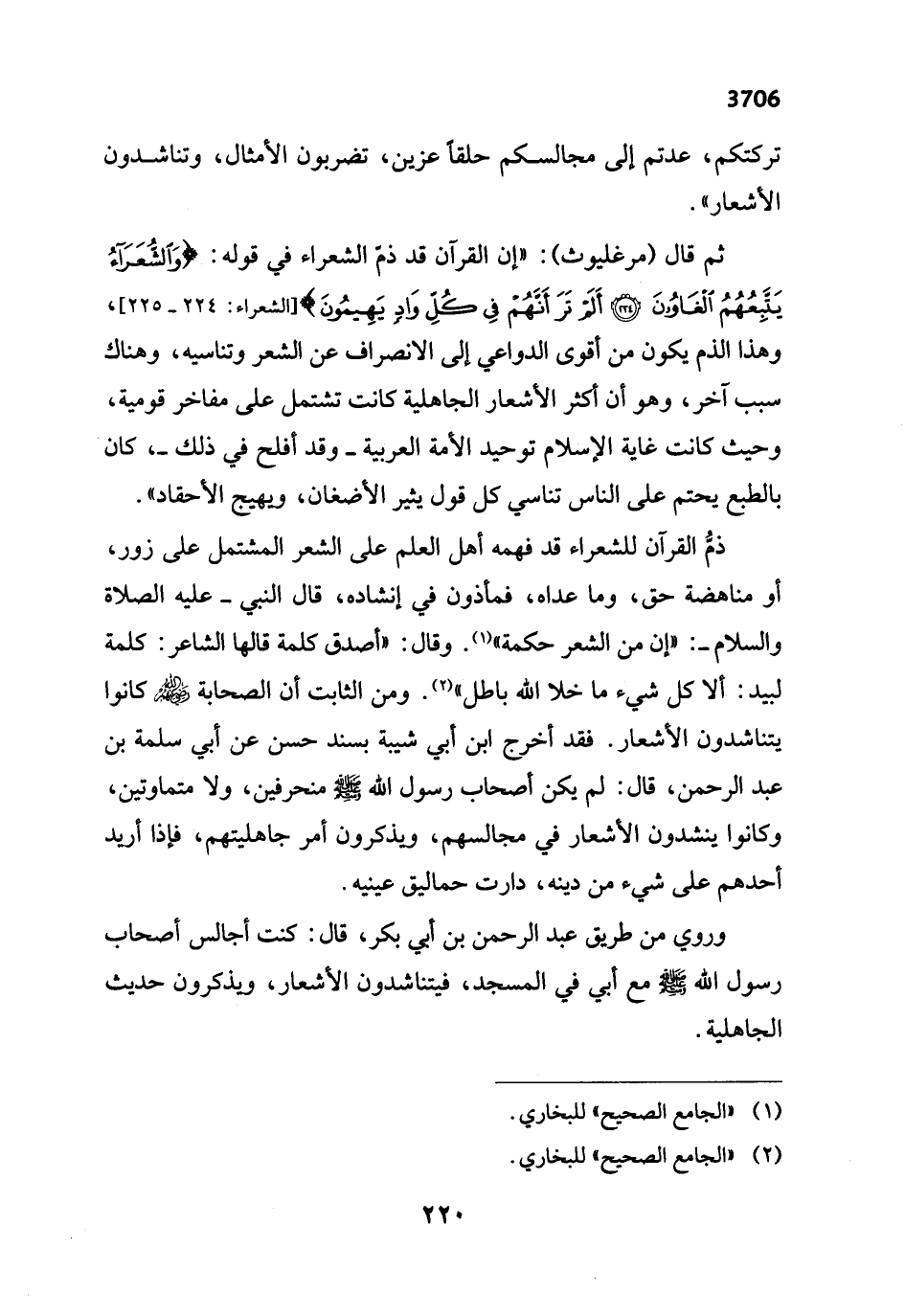ثم قال (مرغليوث): "إن القرآن قد ذمّ الشعراء في قوله: {وَالشُّعَرَاءُ يَتَّبِعُهُمُ الْغَاوُونَ (224) أَلَمْ تَرَ أَنَّهُمْ فِي كُلِّ وَادٍ يَهِيمُونَ} [الشعراء: 224 - 225]، وهذا الذم يكون من أقوى الدواعي إلى الانصراف عن الشعر وتناسيه، وهناك سبب آخر، وهو أن أكثر الأشعار الجاهلية كانت تشتمل على مفاخر قومية، وحيث كانت غاية الإسلام توحيد الأمة العربية -وقد أفلح في ذلك-، كان بالطبع يحتم على الناس تناسي كل قول يثير الأضغان، ويهيج الأحقاد".