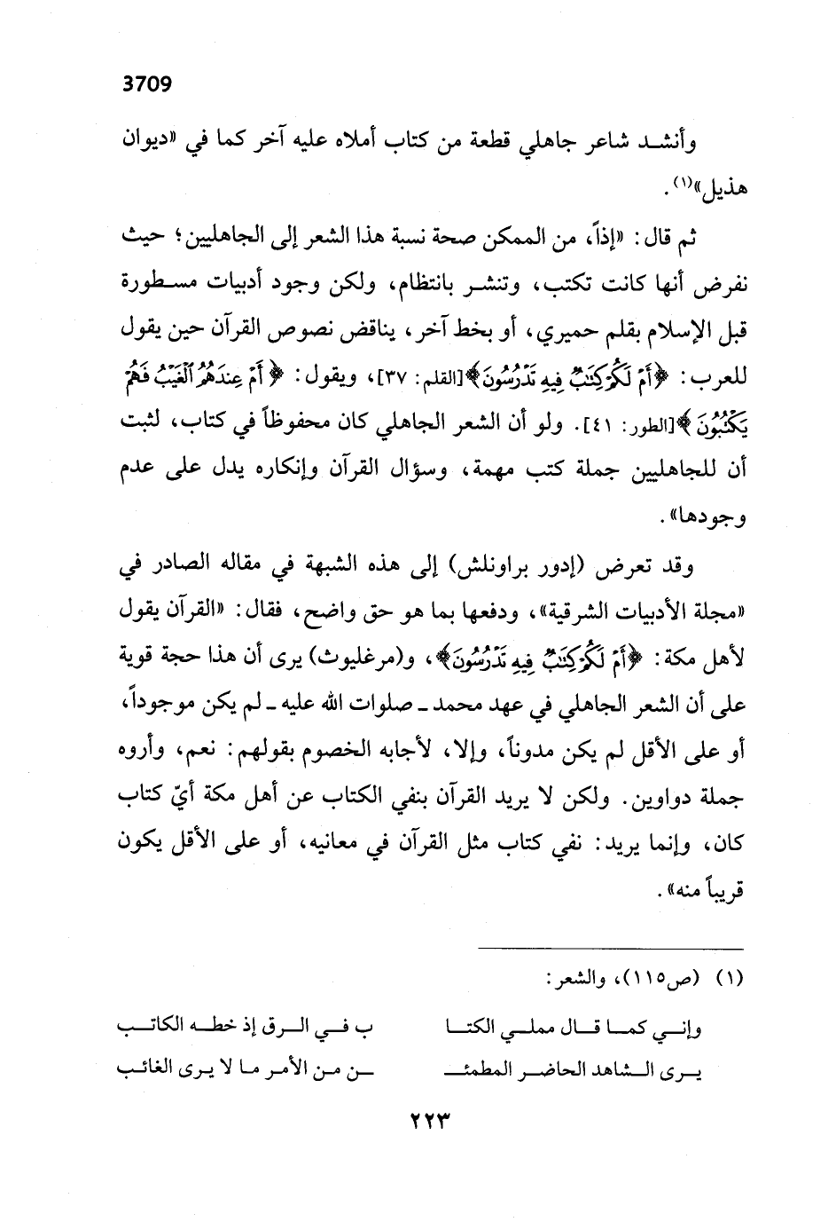 وقد تعرض (إدور براونلش) إلى هذه الشبهة في مقاله الصادر في "مجلة الأدبيات الشرقية"، ودفعها بما هو حق واضح، فقال: "القرآن يقول لأهل مكة: {أَمْ لَكُمْ كِتَابٌ فِيهِ تَدْرُسُونَ}، و (مرغليوث) يرى أن هذا حجة قوية على أن الشعر الجاهلي في عهد محمد - صلوات الله عليه - لم يكن موجوداً، أو على الأقل لم يكن مدونًا، وإلا، لأجابه الخصوم بقولهم: نعم، وأروه جملة دواوين. ولكن لا يريد القرآن بنفي الكتاب عن أهل مكة أيّ كتاب كان، وإنما يريد: نفي كتاب مثل القرآن في معانيه، أو على الأقل يكون قريباً منه".