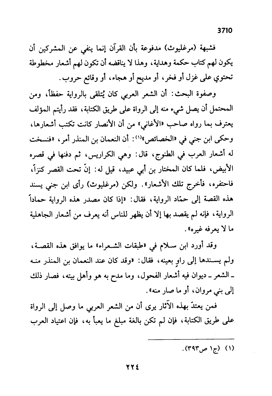 وصفوة البحث: أن الشعر العربي كان يُتلقى بالرواية حفظاً، ومن المحتمل أن يصل شيء منه إلى الرواة على طريق الكتابة، فقد رأيتم المؤلف يعترف بما رواه صاحب "الأغاني" من أن الأنصار كانت تكتب أشعارها، وحكى ابن جني في "الخصائص" (¬1): أن النعمان بن المنذر أمر، "فنسخت له أشعار العرب في الطنوج، قال: وهي الكراريس، ثم دفنها في قصره الأبيض، فلما كان المختار بن أبي عبيد، قيل له: إنّ تحت القصر كنزاً، فاحتفره، فأخرج تلك الأشعار". ولكن (مرغليوث) رأى ابن جني يسند هذه القصة إلى حمّاد الرواية، فقال: "إذا كان مصدر هذه الرواية حمادًا الرواية، فإنه لم يقصد بها إلا أن يظهر للناس أنه يعرف من أشعار الجاهلية ما لا يعرفه غيره".
