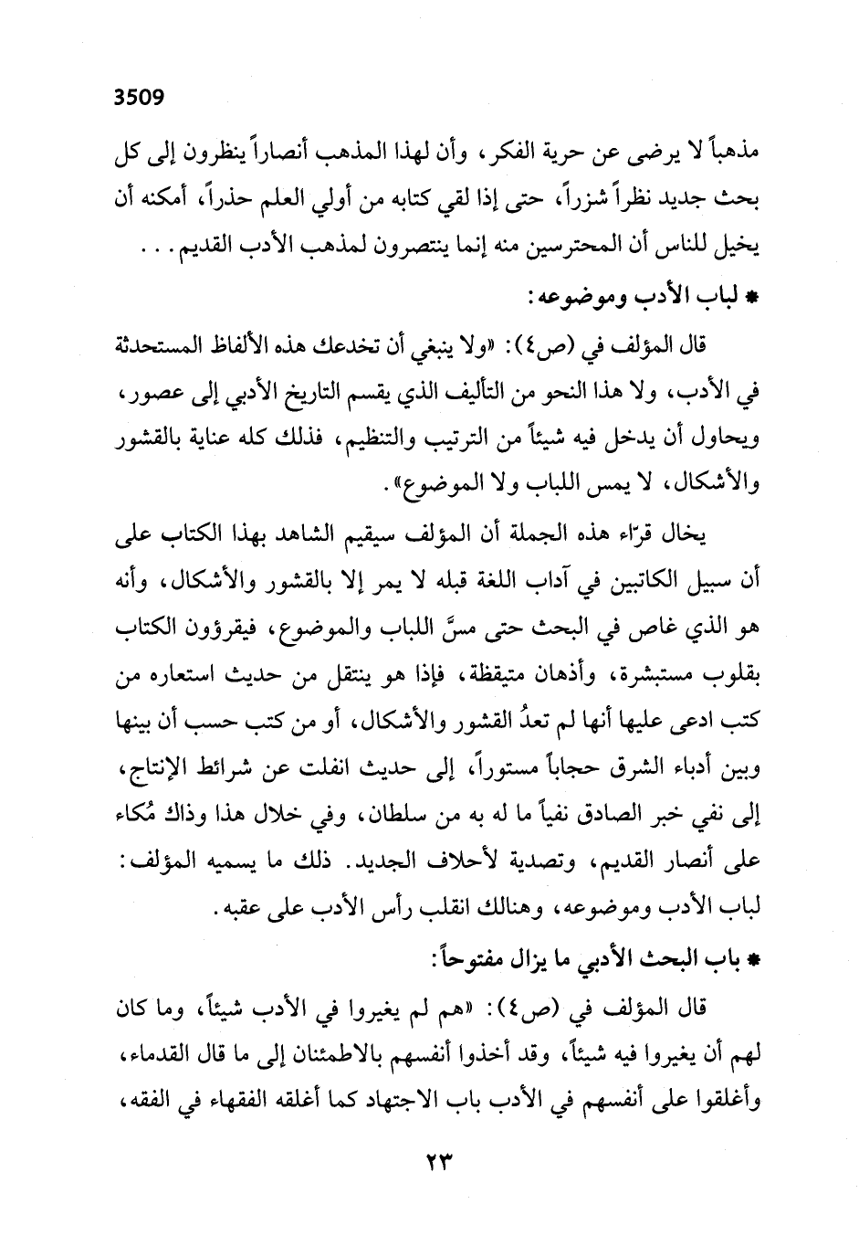 قال المؤلف في (ص 4): "هم لم يغيروا في الأدب شيئاً، وما كان لهم أن يغيروا فيه شيئاً، وقد أخذوا أنفسهم بالاطمئنان إلى ما قال القدماء، وأغلقوا على أنفسهم في الأدب باب الاجتهاد كما أغلقه الفقهاء في الفقه،