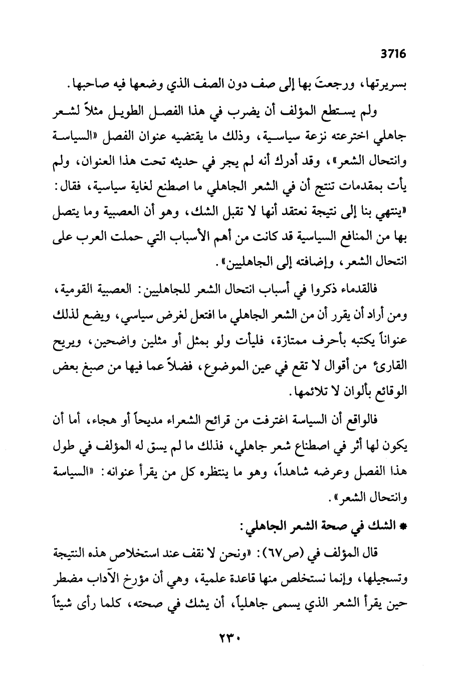قال المؤلف في (ص 67): "ونحن لا نقف عند استخلاص هذه النتيجة وتسجيلها، وإنما نستخلص منها قاعدة علمية، وهي أن مؤرخ الآداب مضطر حين يقرأ الشعر الذي يسمى جاهلياً، أن يشك في صحته، كلما رأى شيئاً