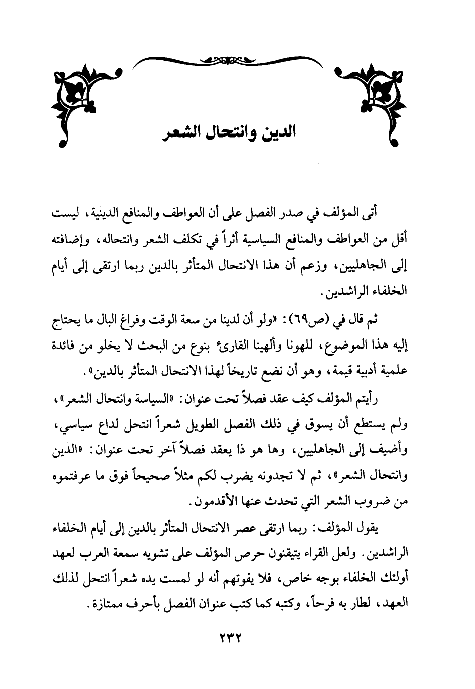 رأيتم المؤلف كيف عقد فصلاً تحت عنوان: "السياسة وانتحال الشعر"، ولم يستطع أن يسوق في ذلك الفصل الطويل شعرًاا نتحل لدل سياسي، وأضيف إلى الجاهليين، وها هو ذا يعقد فصلاً آخر تحت عنوان: "الدين وانتحال الشعر"، ثم لا تجدونه يضرب لكم مثلاً صحيحاً فوق ما عرفتموه من ضروب الشعر التي تحدث عنها الأقدمون.