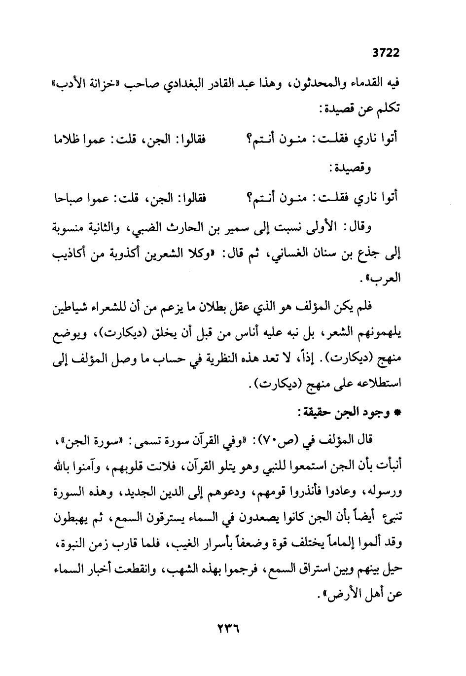 فلم يكن المؤلف هو الذي عقل بطلان ما يزعم من أن للشعراء شياطين يلهمونهم الشعر، بل نبه عليه أناس من قبل أن يخلق (ديكارت)، ويوضع منهج (ديكارت). إذاً، لا تعد هذه النظرية في حساب ما وصل المؤلف إلى استطلاعه على منهج (ديكارت).