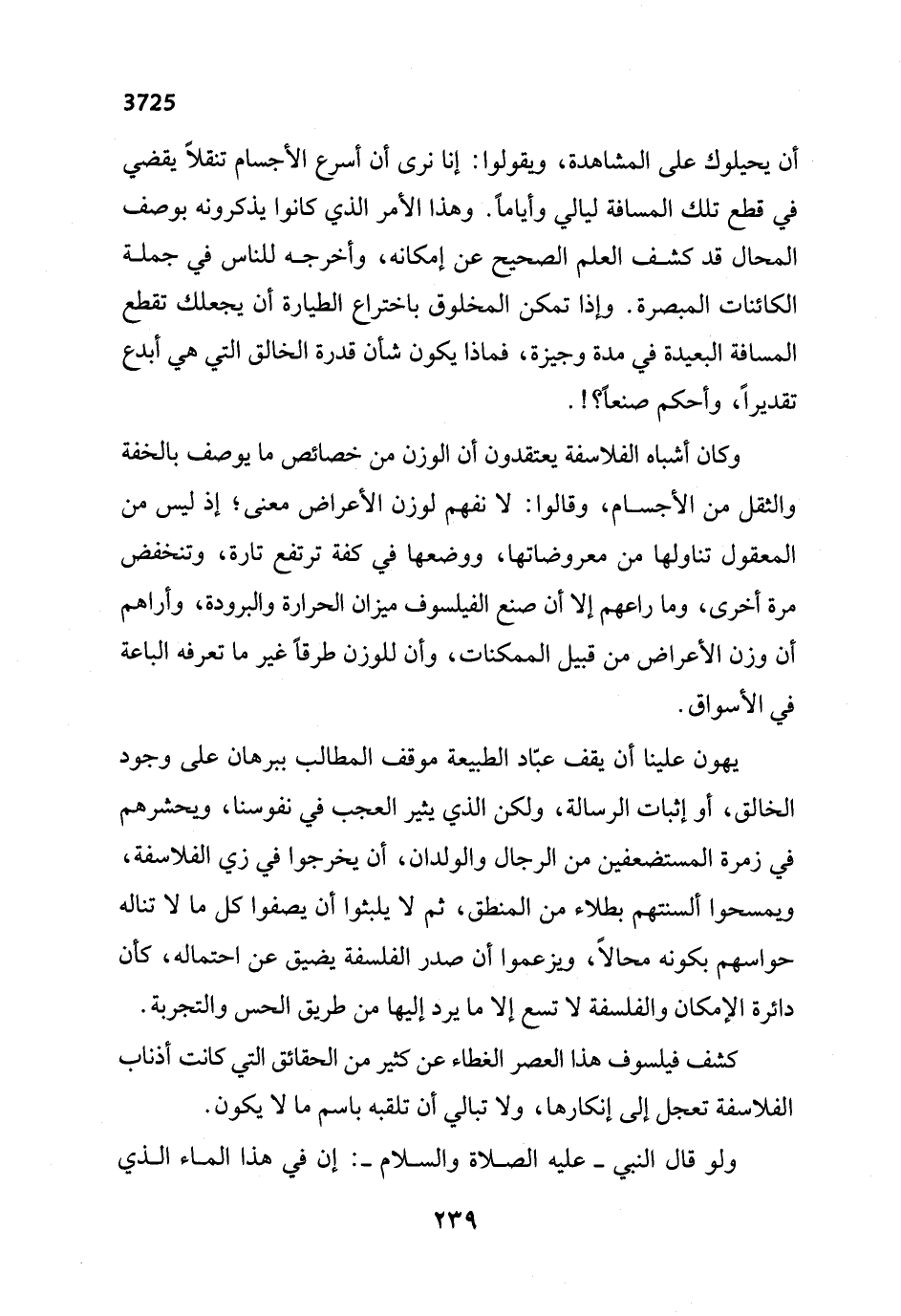 يهون علينا أن يقف عبّاد الطبيعة موقف المطالب ببرهان على وجود الخالق، أو إثبات الرسالة، ولكن الذي يثير العجب في نفوسنا، ويحشرهم في زمرة المستضعفين من الرجال والولدان، أن يخرجوا في زي الفلاسفة، ويمسحوا ألسنتهم بطلاء من المنطق، ثم لا يلبثوا أن يصفوا كل ما لا تناله حواسهم بكونه محالًا، ويزعموا أن صدر الفلسفة يضيق عن احتماله، كأن دائرة الإمكان والفلسفة لا تسع إلا ما يرد إليها من طريق الحس والتجربة.