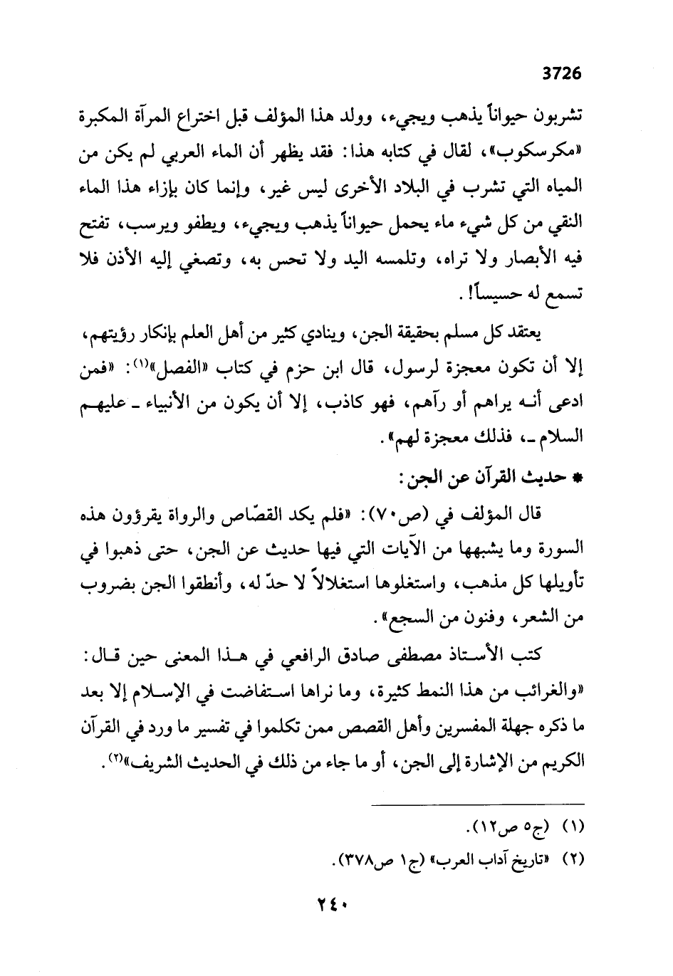 كتب الأستاذ مصطفى صادق الرافعي في هذا المعنى حين قال: "والغرائب من هذا النمط كثيرة، وما نراها استفاضت في الإسلام إلا بعد ما ذكره جهلة المفسرين وأهل القصص ممن تكلموا في تفسير ما ورد في القرآن الكريم من الإشارة إلى الجن، أو ما جاء من ذلك في الحديث الشريف" (¬2).
