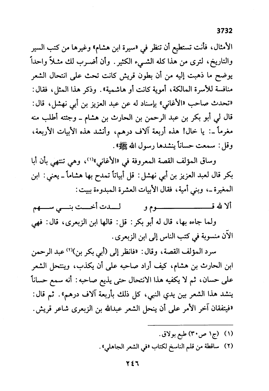 الأمثال، فأنت تستطيع أن تنظر في "سيرة ابن هشام" وغيرها من كتب السير والتاريخ، لترى من هذا كله الشيء الكثير. وأن أضرب لك مثلاً واحداً يوضح ما ذهبت إليه من أن بطون قريش كانت تحث على انتحال الشعر منافسة للأسرة المالكة، أموية كانت أو هاشمية". وذكر هذا المثل، فقال: "تحدث صاحب "الأغاني" بإسناد له عن عبد العزيز بن أبي نهشل، قال: قال لي أبو بكر بن عبد الرحمن بن الحارث بن هشام - وجئته أطلب منه مغرماً-: يا خال! هذه أربعة آلاف درهم، وأنشد هذه الأبيات الأربعة، وقل: سمعت حساناً ينشدها رسول الله - صلى الله عليه وسلم - ".