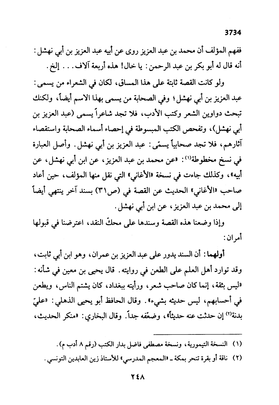 ولو كانت القصة ثابتة على هذا المساق، لكان في الشعراء من يسمى: عبد العزيز بن أبي نهشل؛ وفي الصحابة من يسمى بهذا الاسم أيضاً، ولكنك تبحث دواوين الشعر وكتب الأدب، فلا تجد شاعراً يسمى (عبد العزيز بن أبي نهشل)، وتفحص الكتب المبسوطة في إحصاء أسماء الصحابة واستقصاء آثارهم، فلا تجد صحابياً يسمّى: عبد العزيز بن أبي نهشل. وأصل العبارة في نسخ مخطوطة (¬1): "عن محمد بن عبد العزيز، عن ابن أبي نهشل، عن أبيه"، وكذلك جاءت في نسخة "الأغاني" التي نقل منها المؤلف، حين أعاد صاحب "الأغاني" الحديث عن القصة في (ص 31) بسند آخر ينتهي أيضاً إلى محمد بن عبد العزيز، عن ابن أبي نهشل.