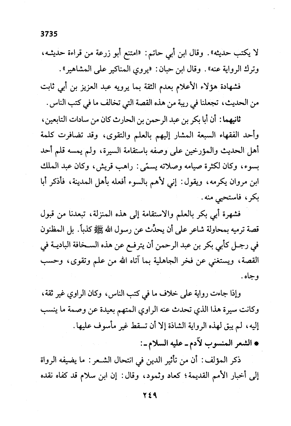 فشهرة أبي بكر بالعلم والاستقامة إلى هذه المنزلة، تبعدنا من قبول قصة ترميه بمحاولة شاعر على أن يحدِّث عن رسول الله - صلى الله عليه وسلم - كذباً. بل المظنون في رجل كأبي بكر بن عبد الرحمن أن يترفع عن هذه السخافة البادية في القصة، ويستغني عن فخر الجاهلية بما آتاه الله من علم وتقوى، وحسب وجاه.