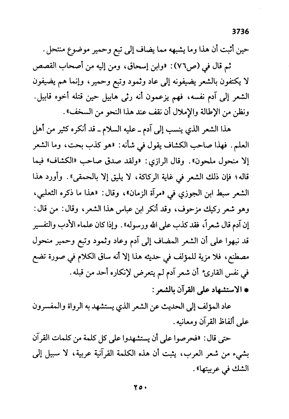 هذا الشعر الذي ينسب إلى آدم - عليه السلام - قد أنكره كثير من أهل العلم. فهذا صاحب الكشاف يقول في شأنه: "هو كذب بحت، وما الشعر إلا منحول ملحون". وقال الرازي: "ولقد صدق صاحب "الكشاف" فيما قاله؛ فإن ذلك الشعر في غاية الركاكة، لا يليق إلا بالحمقى". وأورد هذا الشعر سبط ابن الجوزي في "مرآة الزمان"، وقال: "هذا ما ذكره الثعلبي، وهو شعر ركيك مزحوف، وقد أنكر ابن عباس هذا الشعر، وقال: من قال: إن آدم قال شعراً، فقد كذب على الله ورسوله". وإذا كان علماء الأدب والتفسير قد نبهوا على أن الشعر المضاف إلى آدم وعاد وثمود وتبع وحمير منحول مصطنع، فلا مزية للمؤلف في حديثه هذا إلا أنه ساق الكلام في صورة تضع في نفس القارئ أن شعرآدم لم يتعرض لإنكاره أحد من قبله.