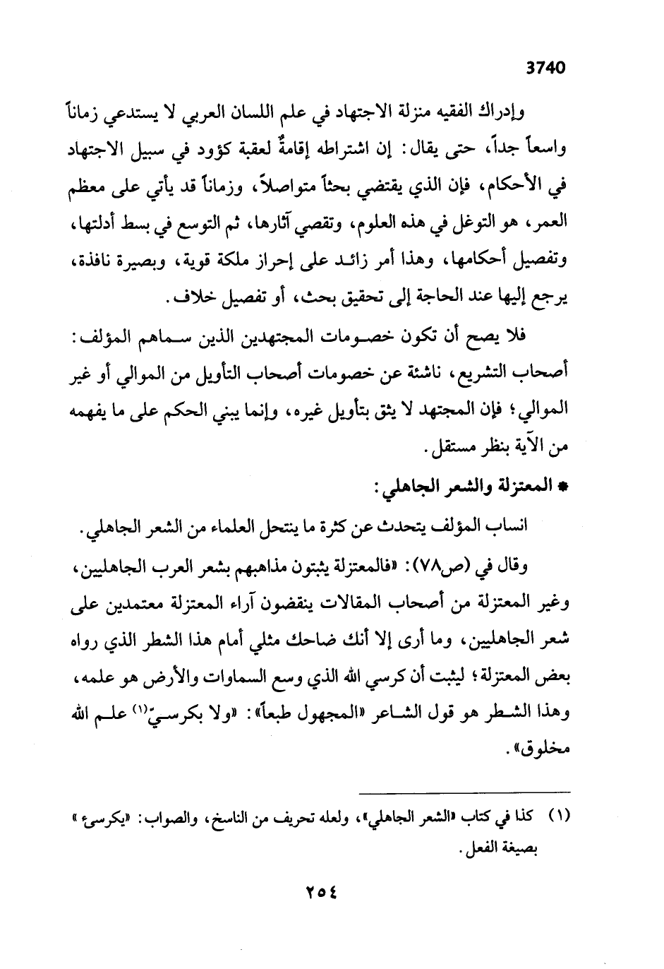 انساب المؤلف يتحدث عن كثرة ما ينتحل العلماء من الشعر الجاهلي. وق الذي (ص 78): "فالمعتزلة يثبتون مذاهبهم بشعر العرب الجاهليين، وغير المعتزلة من أصحاب المقالات ينقضون آراء المعتزلة معتمدين على شعر الجاهليين، وما أرى إلا أنك ضاحك مثلي أمام هذا الشطر الذي رواه بعض المعتزلة؛ ليثبت أن كرسي الله الذي وسع السماوات والأرض هو علمه، وهذا الشطر هو قول الشاعر "المجهول طبعاً": "ولا بكرسيّ (¬1) علم الله مخلوق".