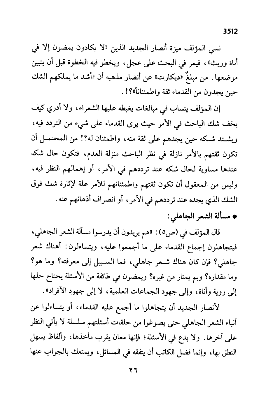 لأنصار الجديد أن يتجاهلوا ما أجمع عليه القدماء، أو يتساءلوا عن أنباء الشعر الجاهلي حتى يصوغوا من حلقات أسئلتهم سلسلة لا يأتي النظر على آخرها. ولا باع في الأسئلة؛ فإنها معان يقرب مأخذها، وألفاظ يسهل النطق بها، وإنما فضل الكاتب أن يتفقه في المسائل، ويمتعك بالجواب عنها
