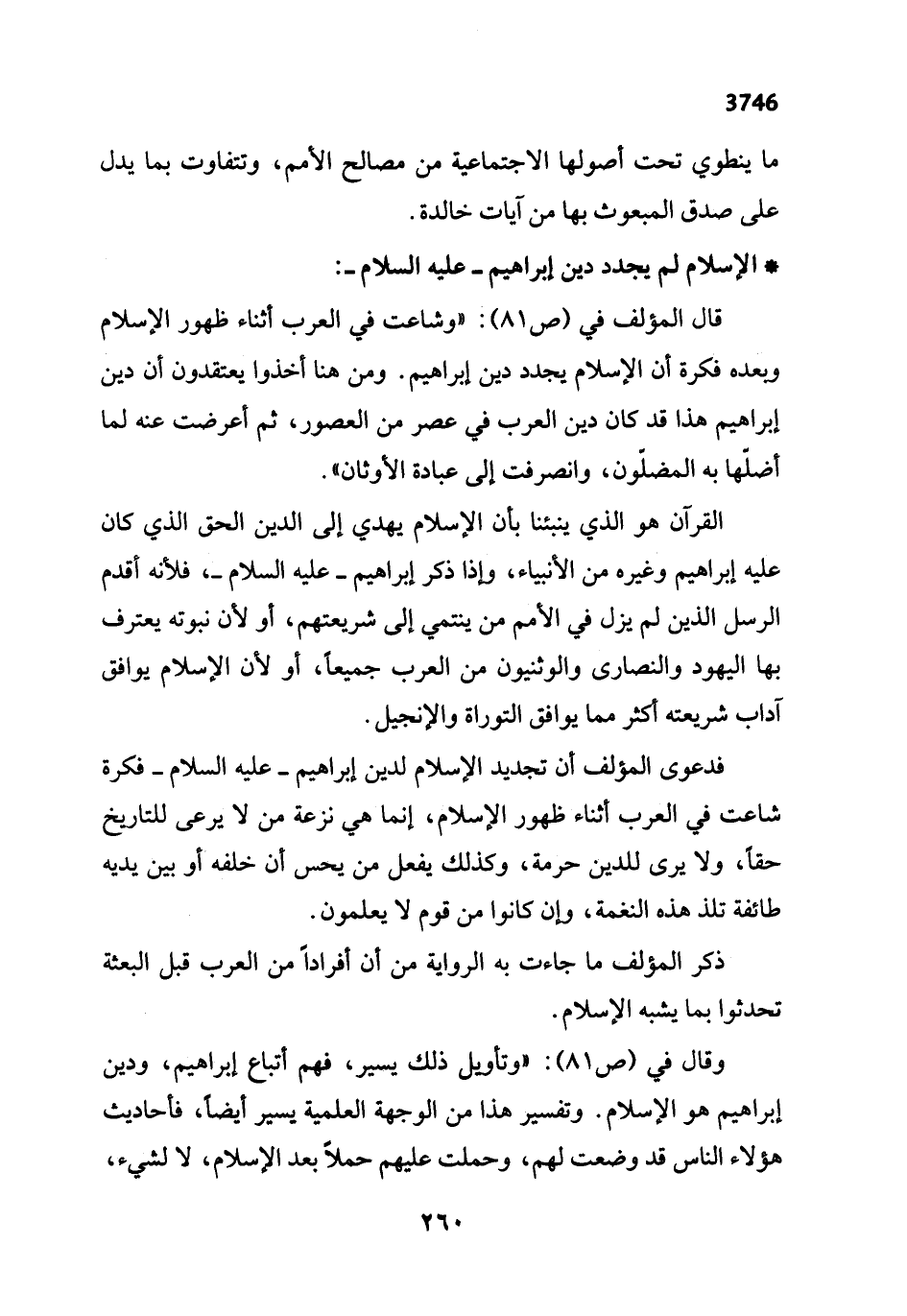 قال المؤلف في (ص 81): "وشاعت في العرب أثناء ظهور الإِسلام ويعده فكرة أن الإِسلام يجدد دين إبراهيم. ومن هنا أخذوا يعتقدون أن دين إبراهيم هذا قد كان دين العرب في عصر من العصور، ثم أعرضت عنه لما أضلّها به المضلّون، وانصرفت إلى عبادة الأوثان".