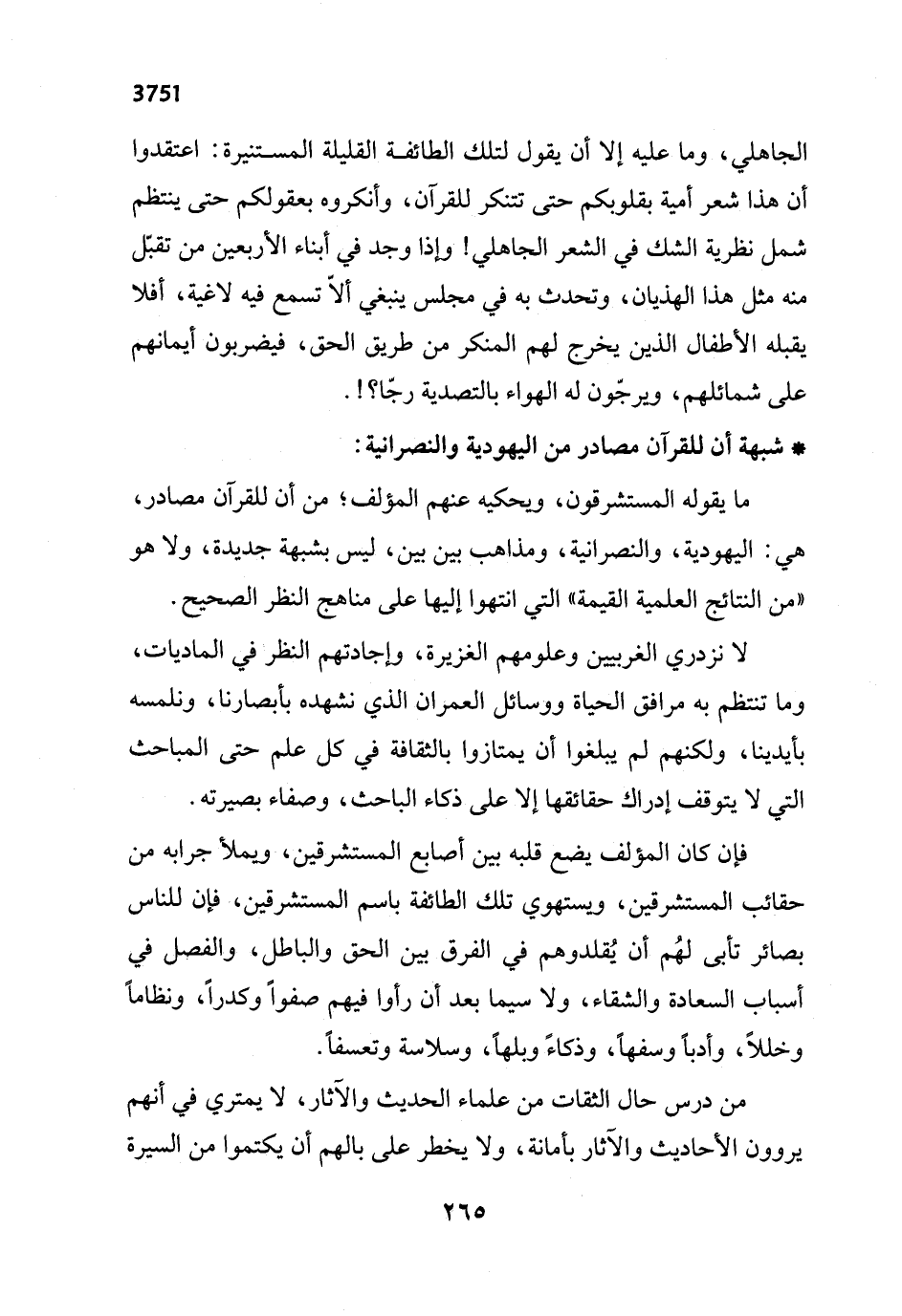 فإن كان المؤلف يضع قلبه بين أصابع المستشرقين، ويملأ جرابه من حقائب المستشرقين، ويستهوي تلك الطائفة باسم المستشرقين، فإن للناس بصائر تأبى لهُم أن يُقلدوهم في الفرق بين الحق والباطل، والفصل في أسباب السعادة والشقاء، ولا سيما بعد أن رأوا فيهم صفواً وكدراً، ونظاماً وخللاً، وأدباً وسفهاً، وذكاءً وبلهًا، وسلاسة وتعسفاً.