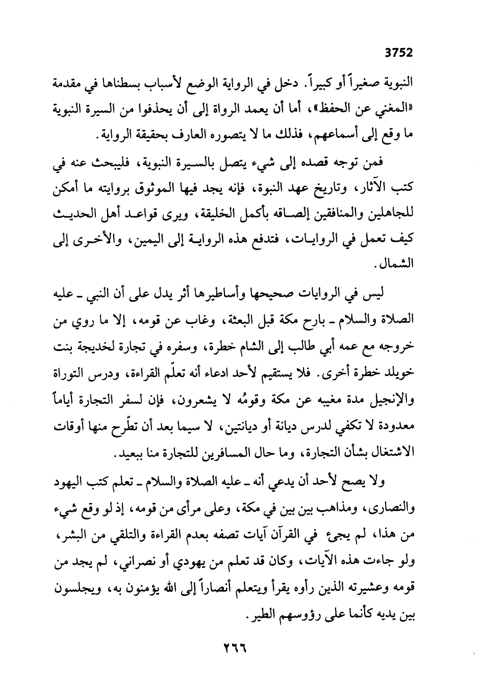 ليس في الروايات صحيحها وأساطيرها أثر يدل على أن النبي - عليه الصلاة والسلام - بارح مكة قبل البعثة، وغاب عن قومه، إلا ما روي من خروجه مع عمه أبي طالب إلى الشام خطرة، وسفره في تجارة لخديجة بنت خويلد خطرة أخرى. فلا يستقيم لأحد ادعاء أنه تعفم القراءة، ودرس التوراة والإنجيل مدة مغيبه عن مكة وقومُه لا يشعرون، فإن لسفر التجارة أياماً معدودة لا تكفي لدرس ديانة أو ديانتين، لا سيما بعد أن تطّرح منها أوقات الاشتغال بشأن التجارة، وما حال المسافرين للتجارة منا ببعيد.