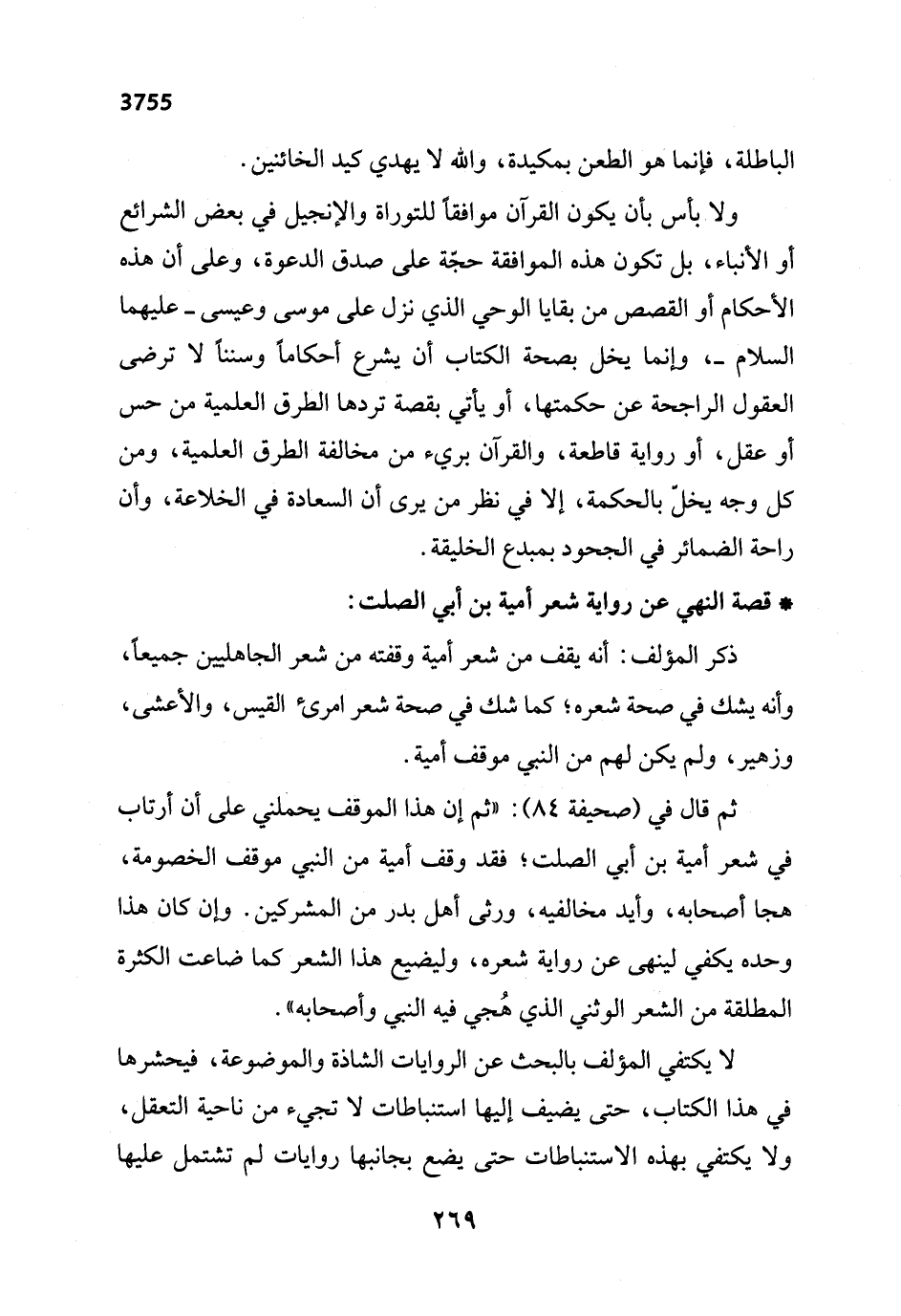 ثم قال في (صحيفة 84): "ثم إن هذا الموقف يحفلني على أن أرتاب في شعر أمية بن أبي الصلت؛ فقد وقف أمية من النبي موقف الخصومة، هجا أصحابه، وأيد مخالفيه، ورثى أهل بدر من المشركين. وإن كان هذا وحده يكفي لينهى عن رواية شعره، وليضيع هذا الشعر كما ضاعت الكثرة المطلقة من الشعر الوثني الذي هُجي فيه النبي وأصحابه".